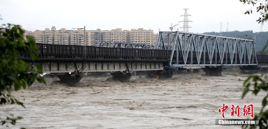 2020年8月17日,四川绵阳,因持续强降雨,加之上游泄洪,四川绵阳市境内涪江流域水位迅速上涨,对宝成铁路涪江大桥造成影响,当日下午,总重量超8100吨的重载货物列车被机车推上大桥,“重车压梁”再次抗洪护桥。图片来源:视觉中国