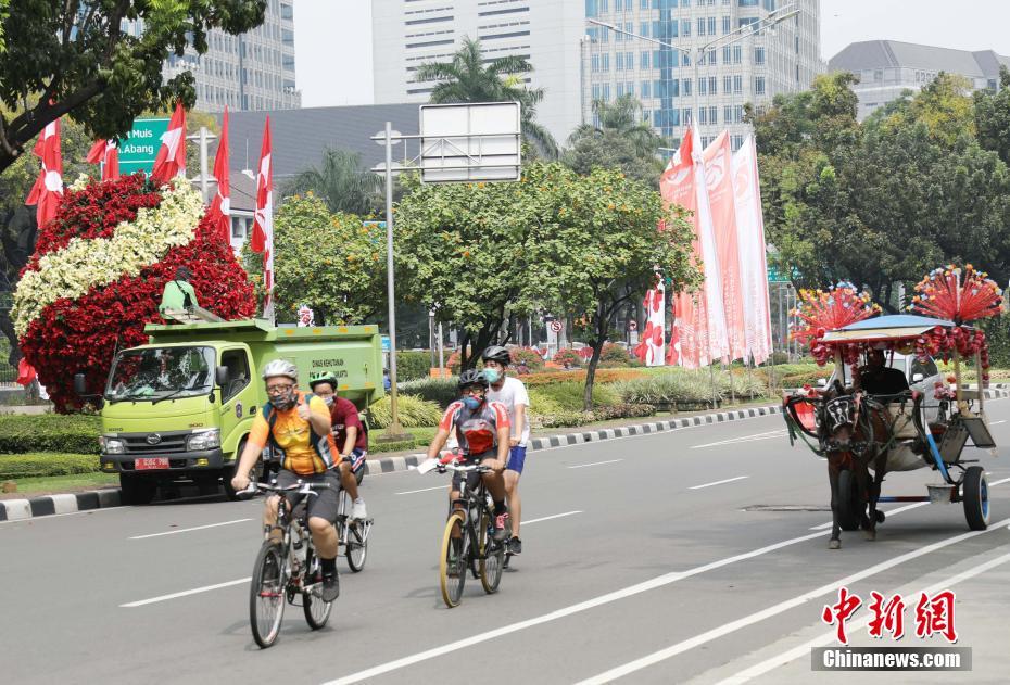 8月17日是印度尼西亚共和国成立75周年纪念日,因为新冠肺炎疫情肆虐,该国取消了原定的许多庆祝活动,仅保留少数人员参加的升旗仪式。图为几位骑行者在雅加达独立广场旁休憩。 中新社记者 林永传 摄