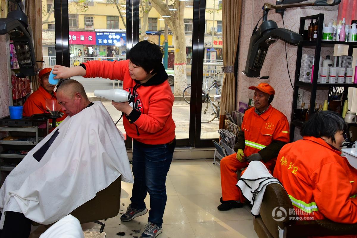 “早上9点钟我们开门,利用半个小时打扫一下店里卫生,然后吃点东西。从9点30到11点,来理发的人不多,因此,想利用这个时间段为辖区的居民做点什么。我们在这开店有将近20年时间,也算有感情了,为辖区老人和环卫工人理个发,是可以的。”女店主说。