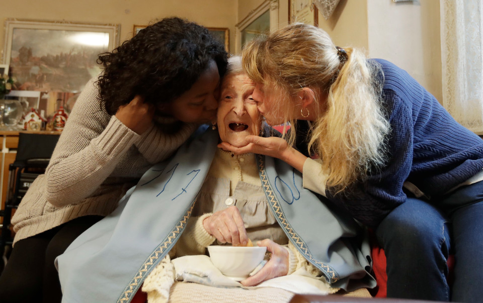 艾玛曾在1937年为前夫乔凡尼-马丁路孕育一个孩子,但是六个月后孩子不幸夭折。第二年,她离开有暴力倾向的前夫,目前居住在意大利北部小镇韦尔巴尼亚。图为护工马乌戈热塔-塞林戈斯卡(Malgorzat Ceglinska)和雅米乐科-贝尔加拉(Yamilec Vergara)亲吻艾玛。