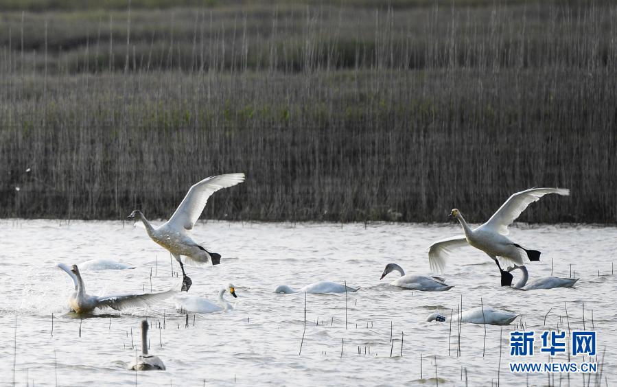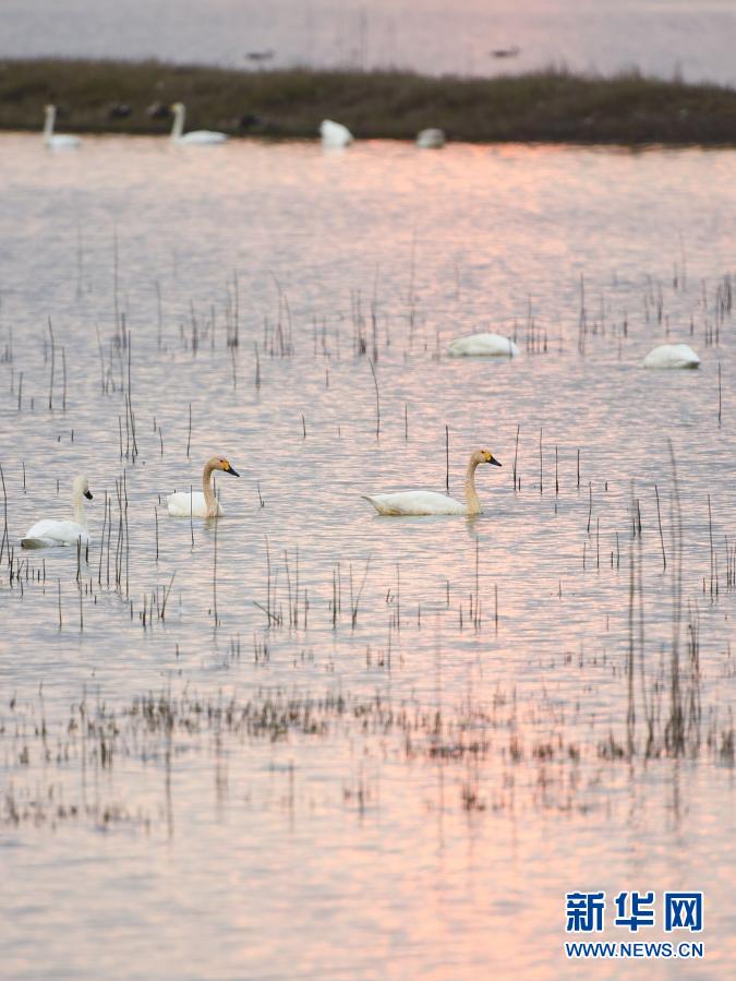 近日,成群的天鹅在迁徙途中飞临南京境内的石臼湖休息、觅食。有着“天空之境”美称的石臼湖变身“天鹅湖”,成为一道美丽的风景。新华社记者 季春鹏 摄
