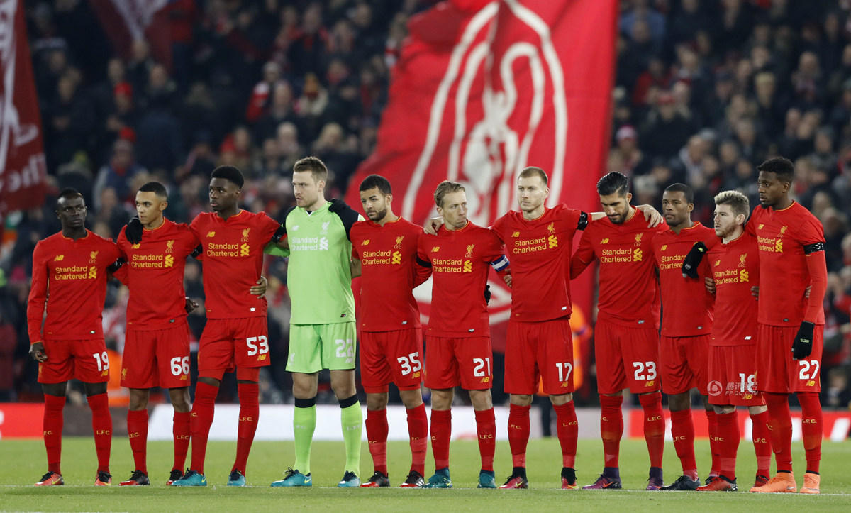 英格兰EFL杯比赛现场,利物浦队在比赛前为遇难的沙佩科恩斯队员默哀一分钟。