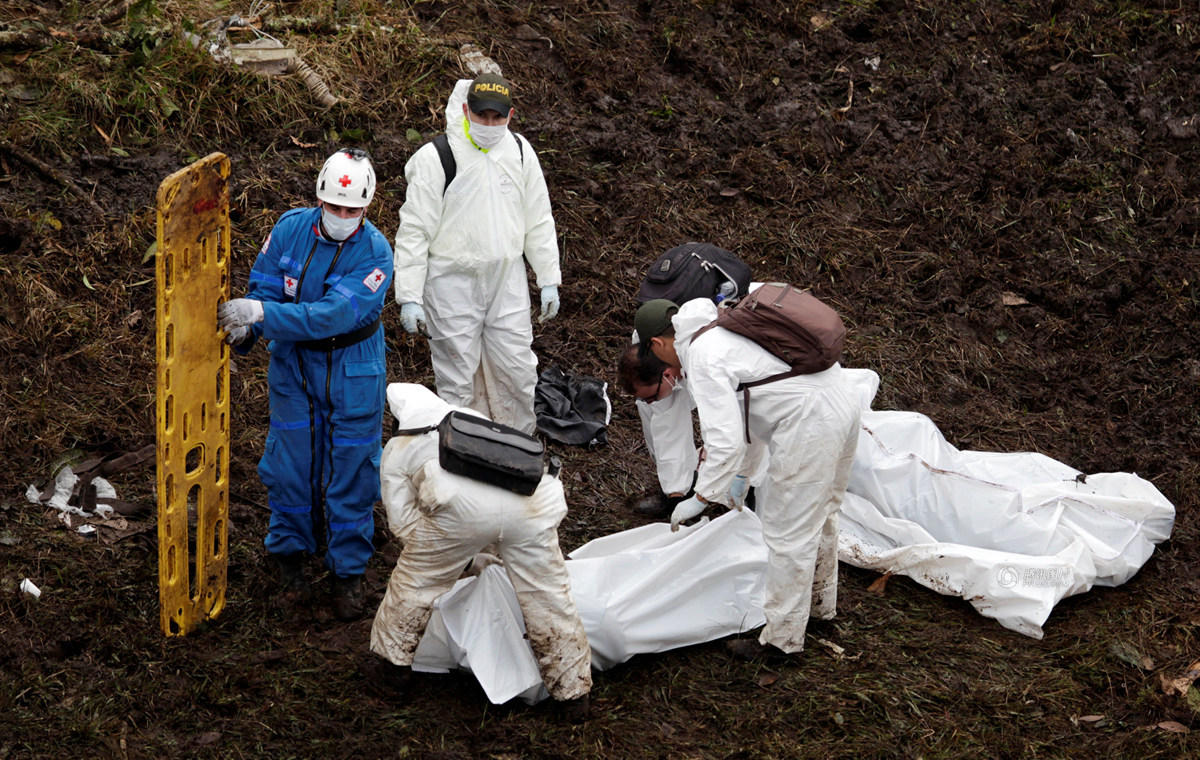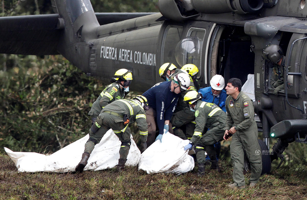 失事客机是从玻利维亚起飞,坠毁前曾向航空塔台报告电路故障。哥伦比亚民航局正在继续搜救,初步推测失事原因可能是燃油不足。图为救援现场,遇难者遗体。