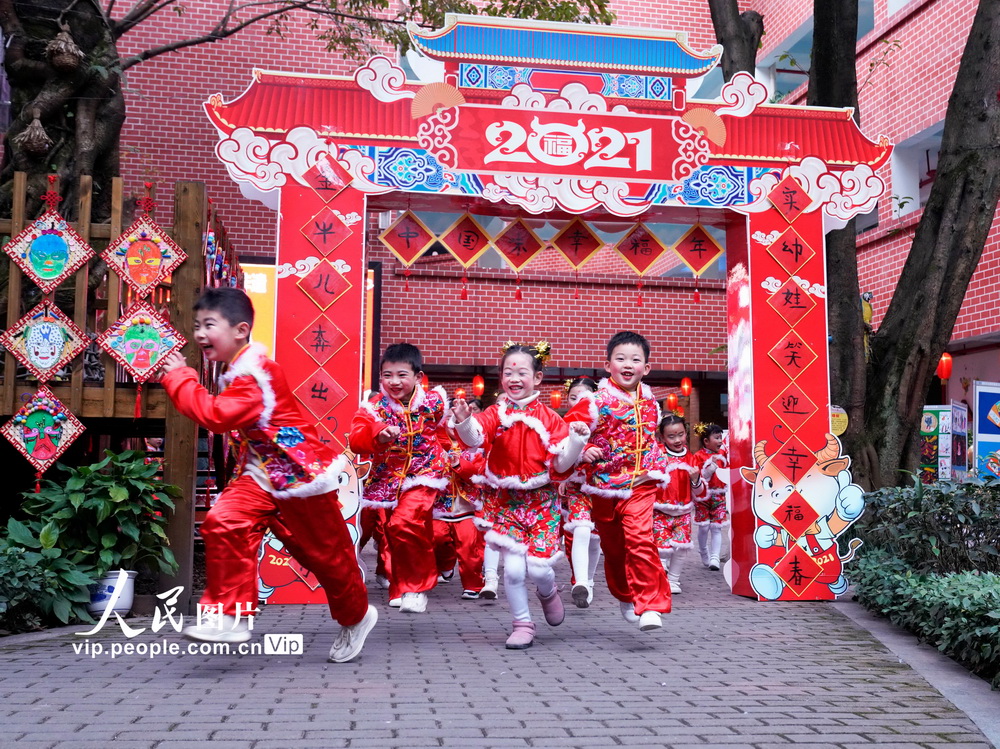 连日来,重庆市北碚区各个中小学和幼儿园相继举行迎元旦文艺演出,孩子们在庆祝活动中感受童趣、欢乐、祥和的新年。秦廷富摄 (人民图片网)