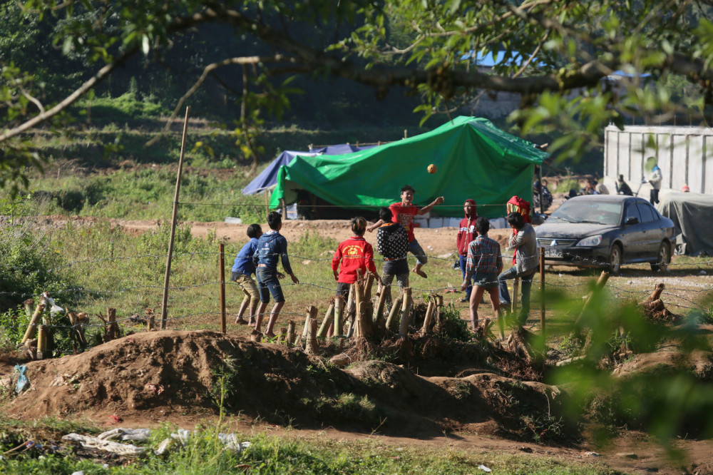 据边民张赛亚称,20日当天早晨7点多,村子里听到枪炮声,村民们生怕被流弹所伤开始逃跑躲避,他家住在畹町河岸,他看到除了桥上骑着摩托车往中国的村民,河里还有蹚水的村民成群结队,他们也就跟着跑到了中国,家里的牛羊那些现在无人照看,村里只留有少部分人,他们出来的不敢回去。在安置点能吃饱睡好,等过一阵子再回去看看。图为一群缅甸小孩在岸边踢足球。