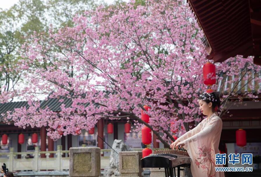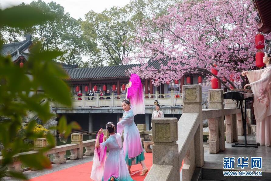 2月27日,演员在武汉东湖樱花园表演节目。当日,武汉东湖樱花园开园,东湖樱花节同步举办。园内绽放的樱花和文艺表演吸引游客前来赏花观景,放松身心。