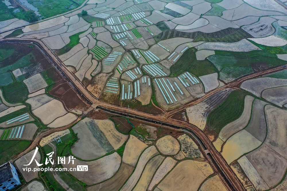 2021年4月12日,湖南省永州市道县白马渡镇樟武坊村,翻耕后的早稻田阡陌纵横,一块块水田紧密相连,宛如无数面镜子,形成一幅天然山水田园画卷。蒋克青摄(人民图片网)