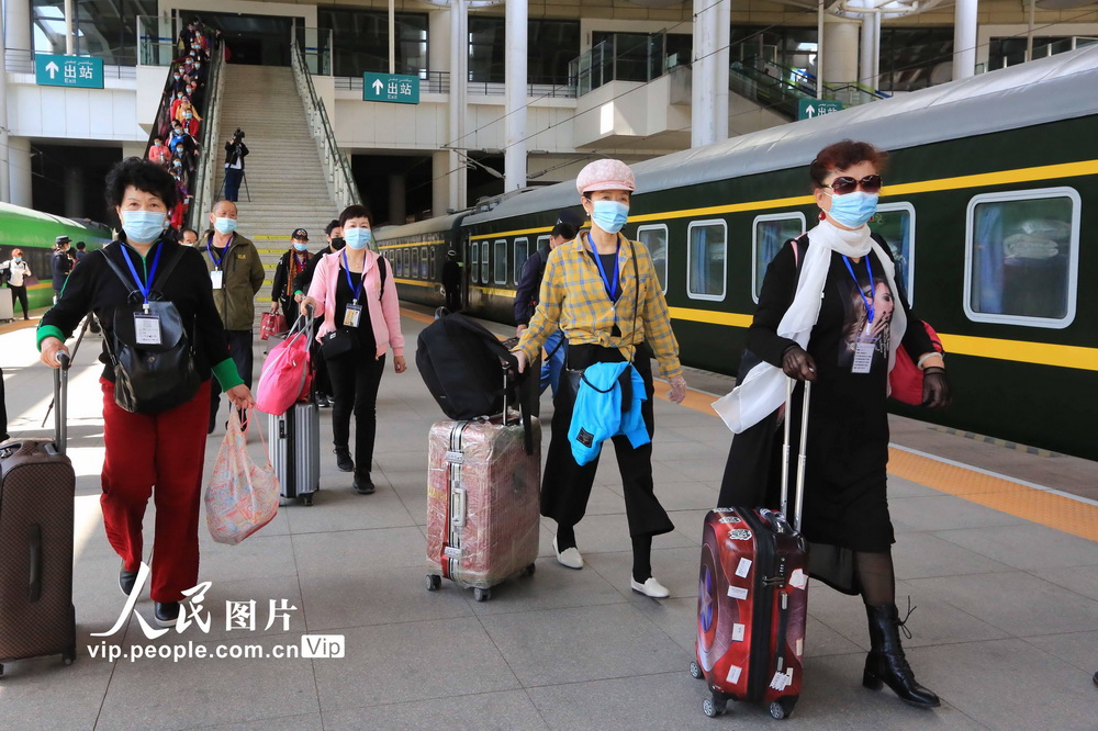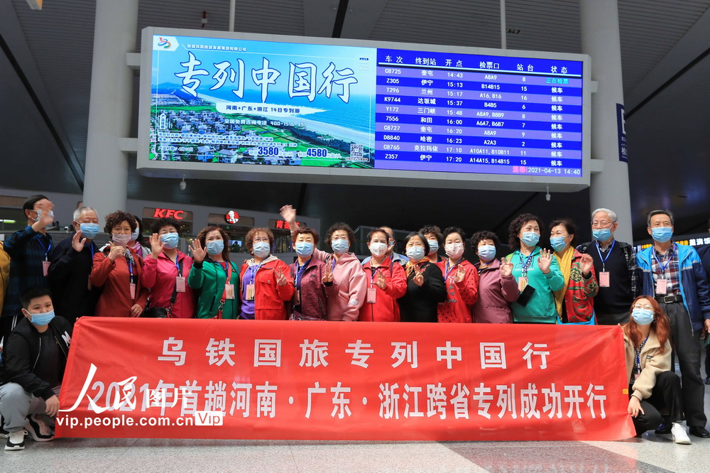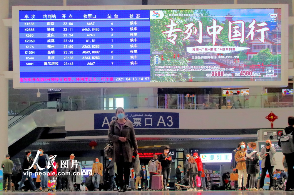 2021年4月13日,新疆铁路今年首趟出疆旅游专列开行,一列序号为Y172次“专列中国行·河南 广东 浙江”文化旅游专列载着500多名游客驶出乌鲁木齐站。在接下来14天的旅程中,他们将游览河南、广东、浙江等地的景区景点,感受祖国大美山河。蔡增乐摄(人民图片网)