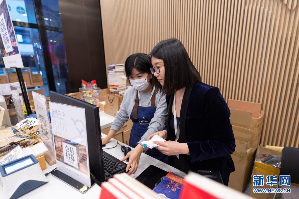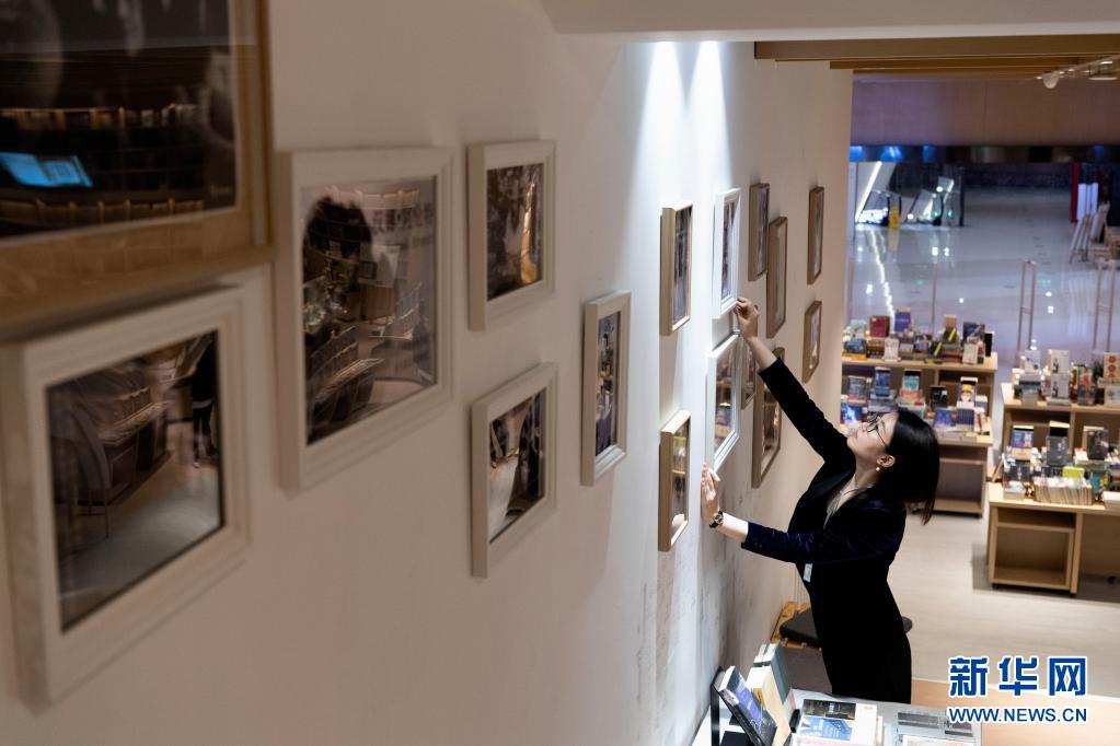 4月22日,在哈尔滨众创书局,于冰摆放书店入口处所陈列图书的推荐语标签。
