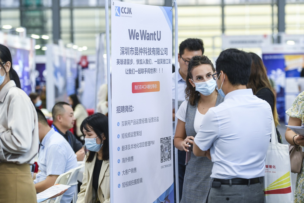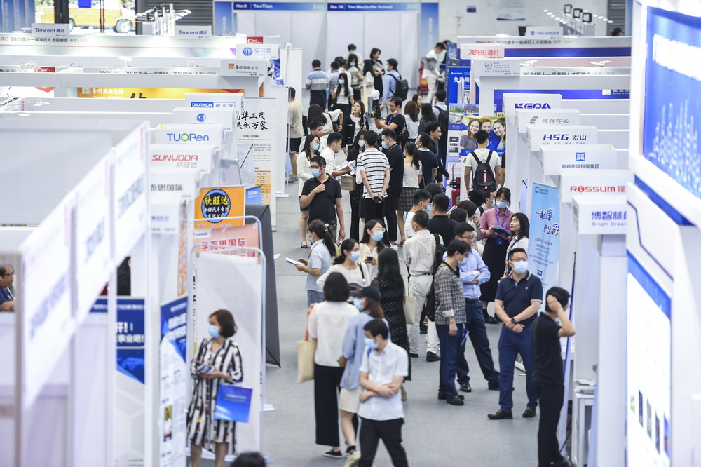 4月24日,第十九届中国国际人才交流大会在深圳开幕。本届大会采用线下线上并重的会展模式,线下规划面积6.3万平方米,共5个展馆,设展览洽谈、人才招聘、主题活动等板块;线上设虚拟展厅、线上招聘、线上会议等功能服务区。据了解,预计有来自30多个国家和地区的1200多家专业机构和组织,万余名海内外政府代表、专家学者、高端人才现场参会。新华社记者 毛思倩 摄