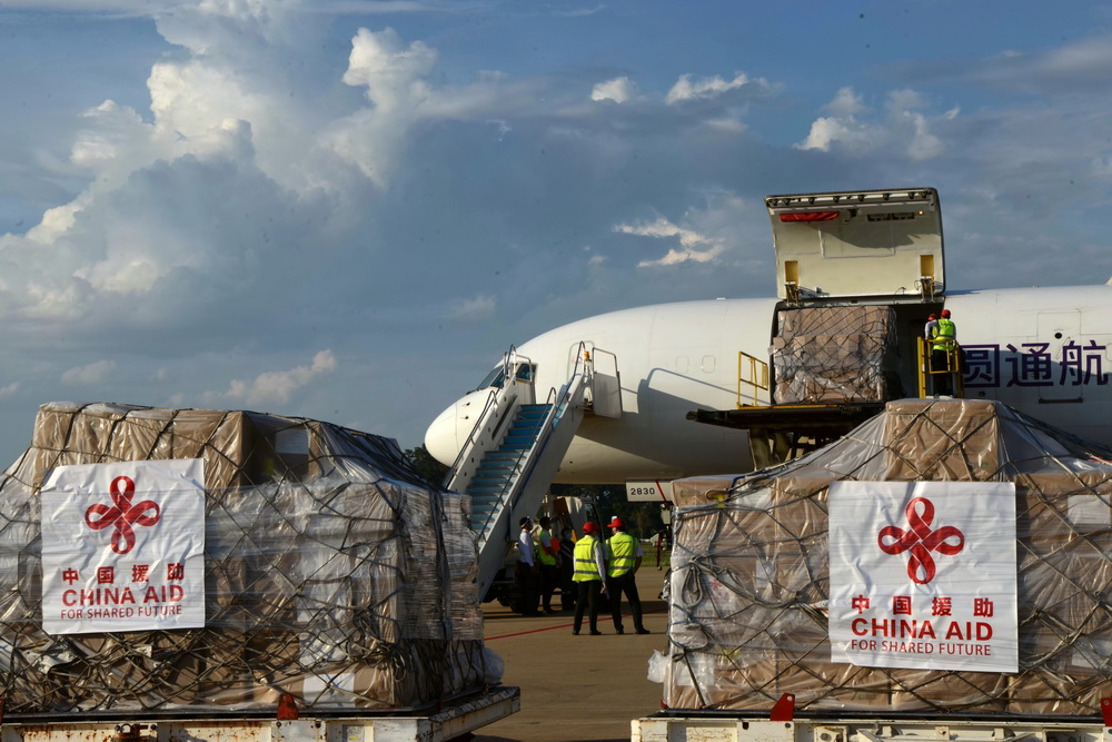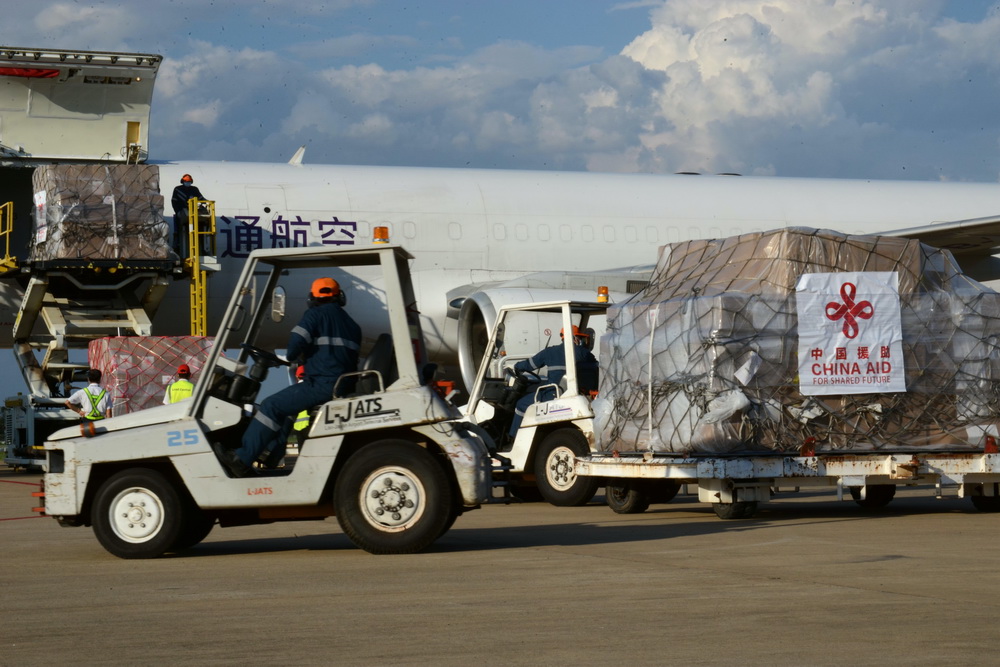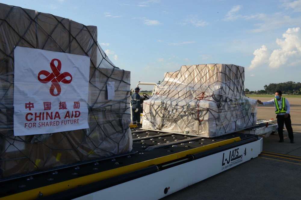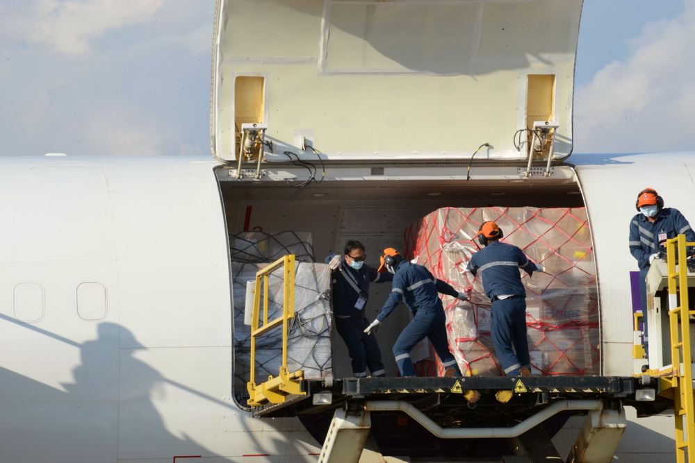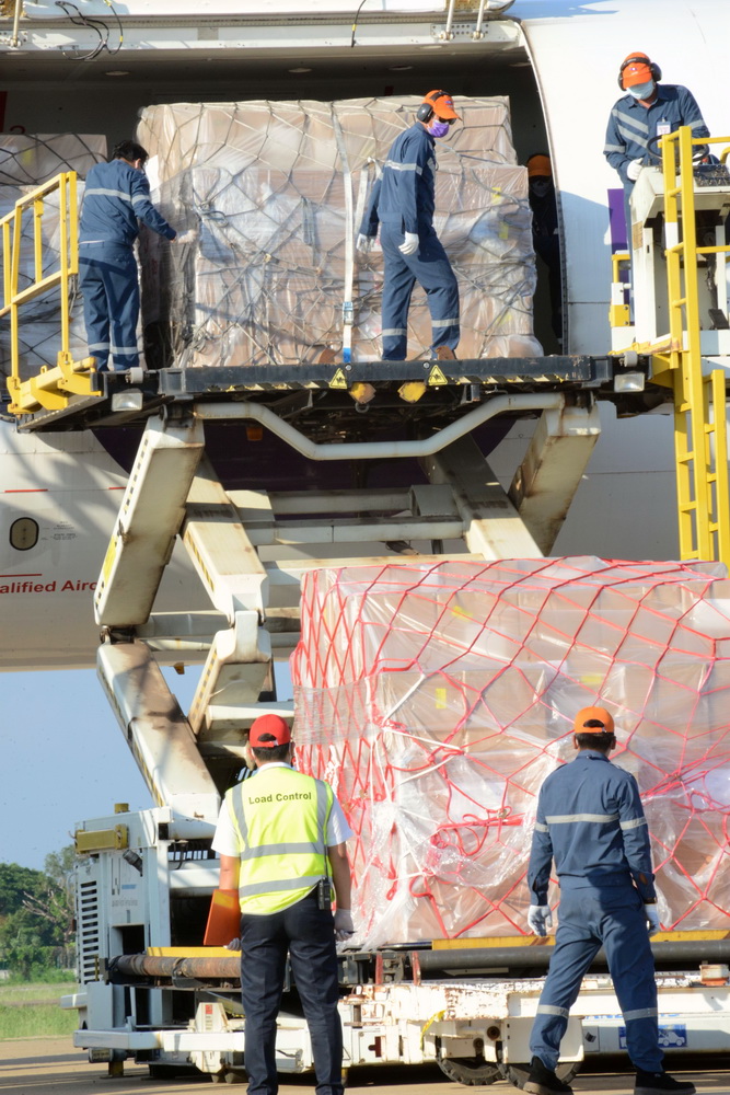中国政府紧急援助老挝的抗击新冠肺炎物资10日由包机运抵万象瓦岱国际机场。今年4月中旬以来,老挝出现本土疫情并急剧扩散,防控形势趋紧。10日交接的中方援助物资主要包括呼吸机、全自动核酸提取仪、口罩、移动式病床、自动高压灭菌器、核酸提取或纯化试剂以及核酸检测试剂盒等。新华社记者 章建华 摄