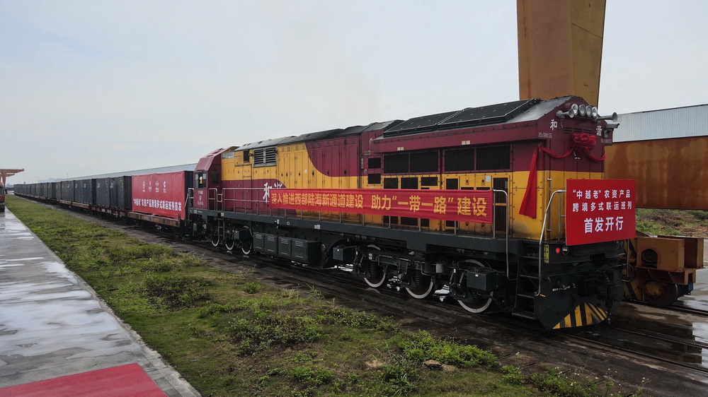 5月13日,广西开行首趟“中越老”农资产品跨境多式联运班列。班列搭载装满复合肥料的集装箱从南宁国际铁路港出发,经凭祥口岸出境,驶往越南,转公路运往老挝。新华社记者 张爱林 摄