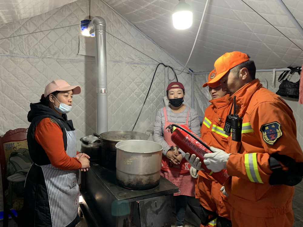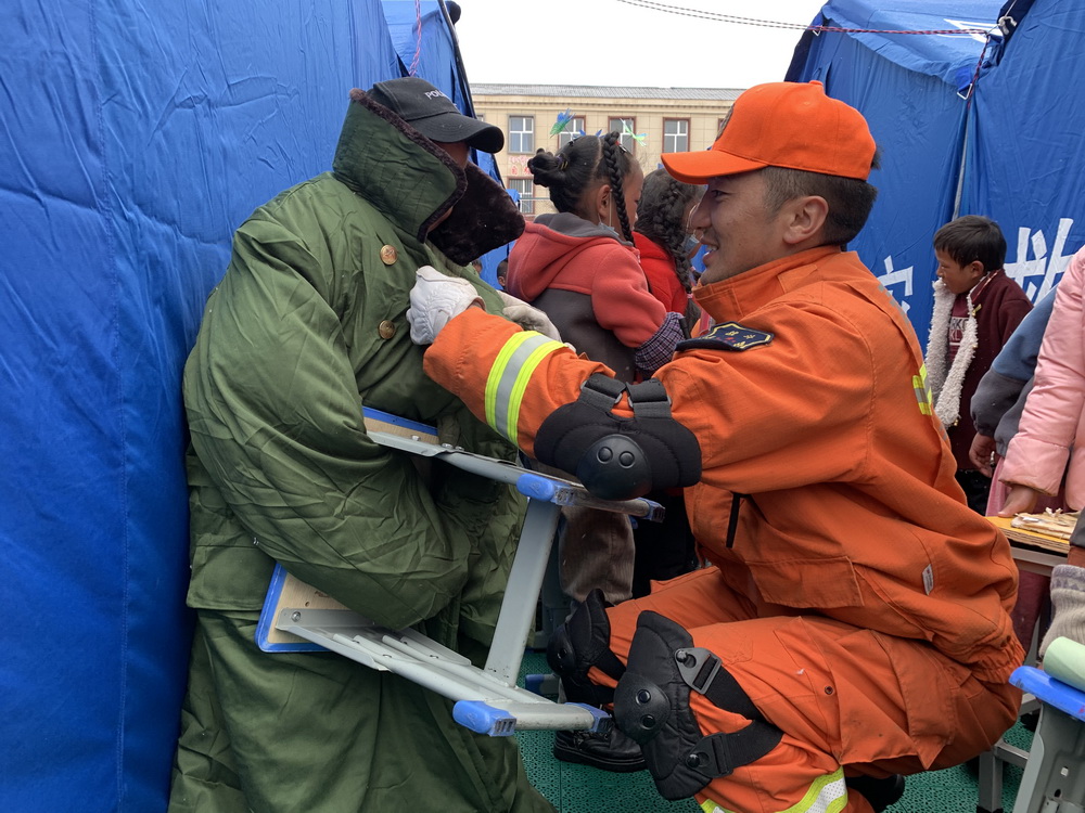 22日,地震发生后,群英尕丁来到安置区搭建帐篷和消防排查,12岁的班玛华桑就与身穿橙色制服的群英尕丁结下了兄弟情谊。“我们是一辈子的兄弟,这几天你也要照顾好自己。”群英尕丁笑着嘱咐班玛华桑。