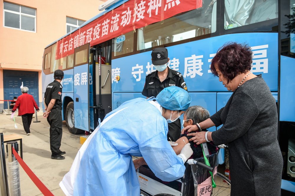 近日,北京市大兴区青云店镇把疫苗接种车开到村民家门口,方便居民接种新冠疫苗。此外,青云店镇还提供专车接送、专人陪护、便民轮椅、绿色通道、老年人接种卡等多种暖心举措,方便老年人接种疫苗。新华社记者 彭子洋 摄