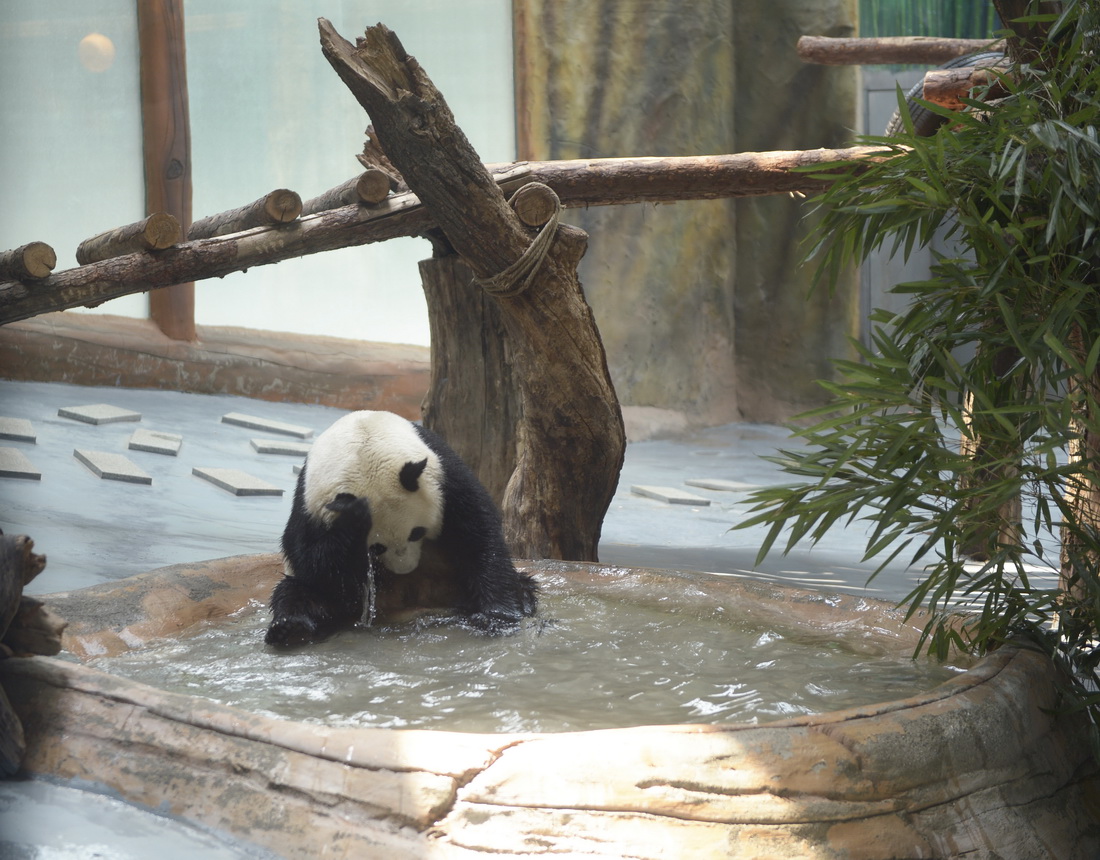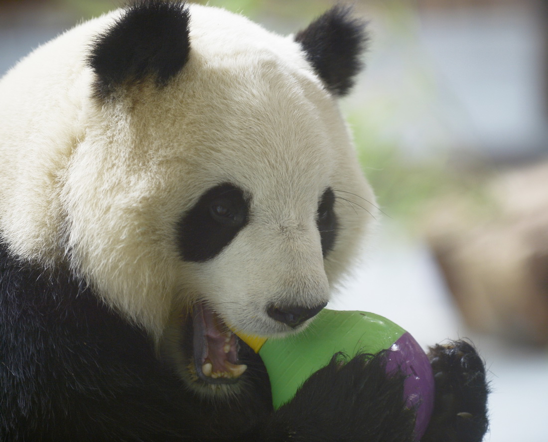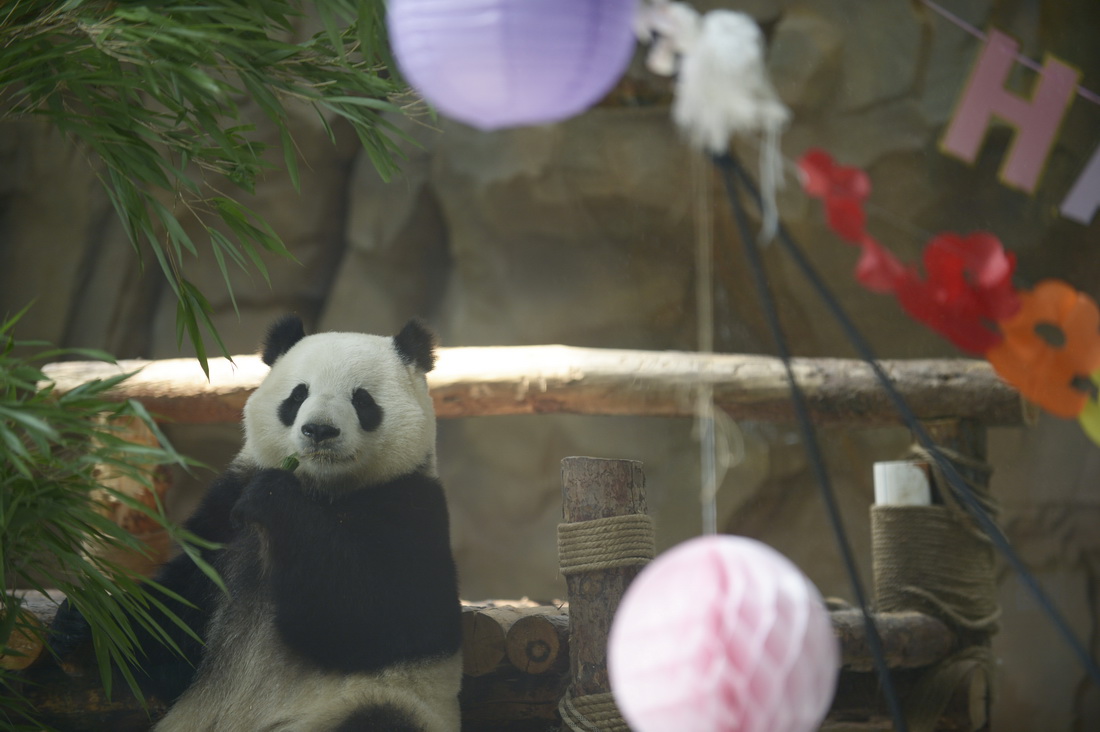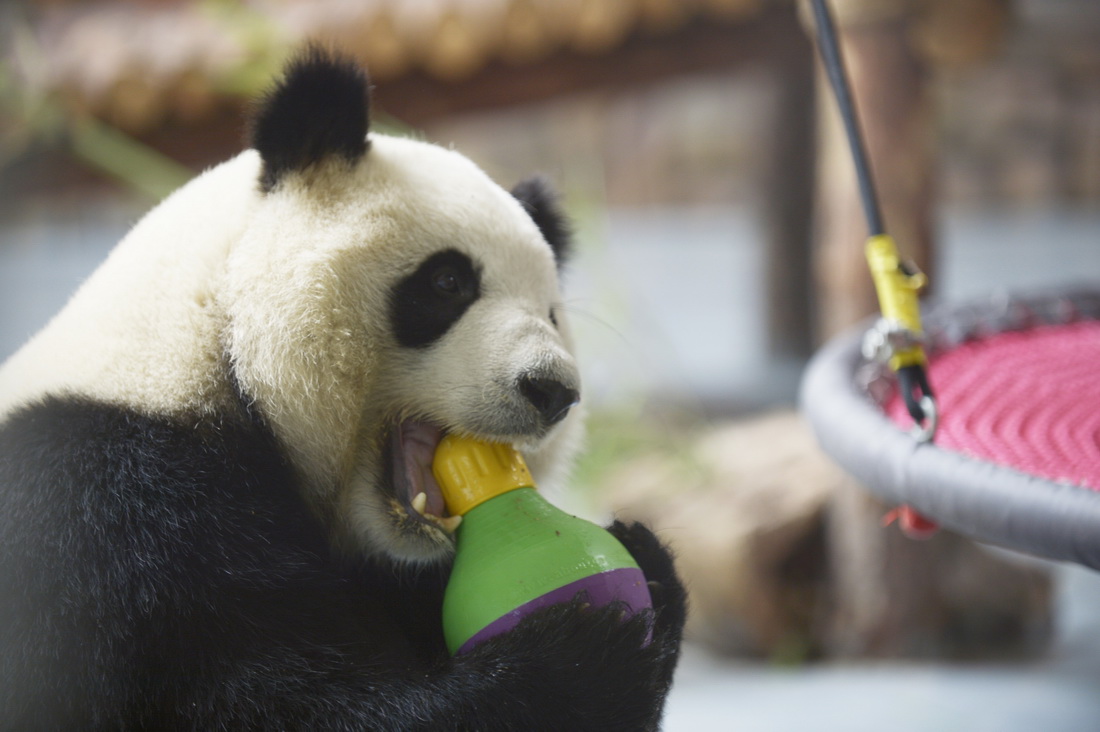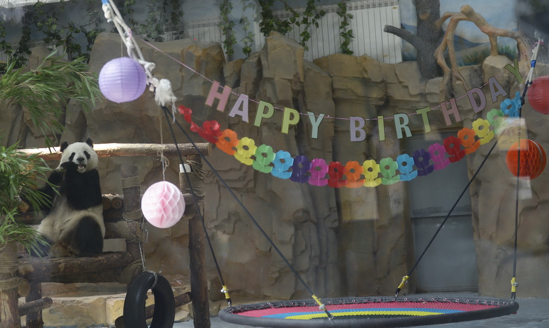 6月27日,在青海省西宁熊猫馆,大熊猫“奇果”“园满”迎来5岁生日会。工作人员用苹果、竹子等食物做成生日蛋糕和美食,还准备了不倒翁取食器等玩具为它们庆生。新华社记者 张曼怡 摄