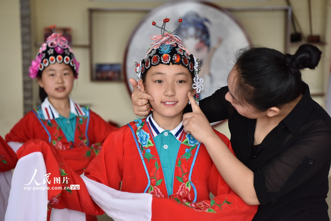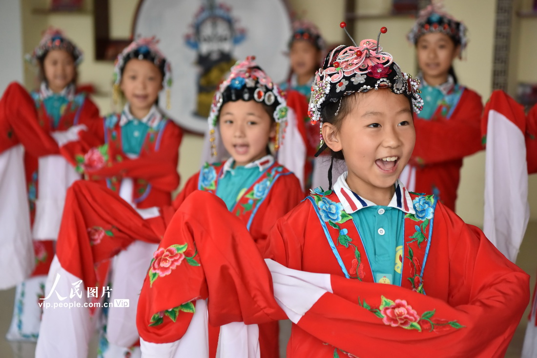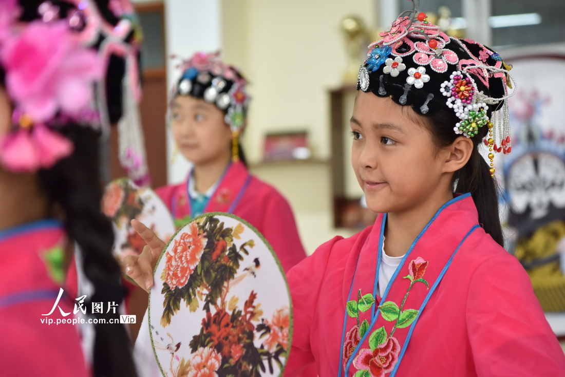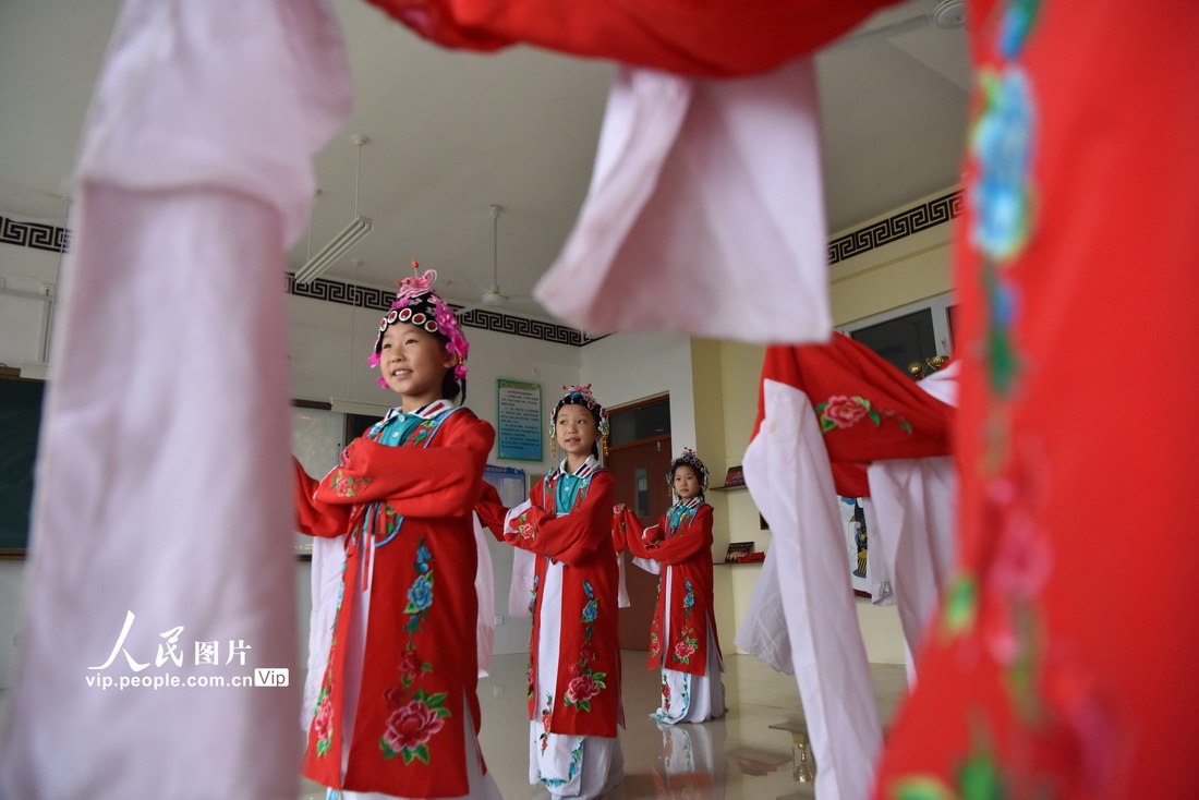 茂腔是山东省高密市的地方传统戏剧,国家级非物质文化遗产之一。近年来,山东省高密市崇实小学通过开设茂腔社团课、校园小剧场展演、茂腔名家进校园等形式推动传统戏曲走进校园,让戏曲融入学生生活,感受传统文化的魅力。李海涛摄(人民图片网)