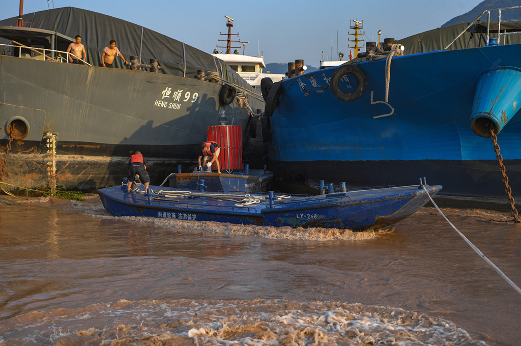 7月13日下午两点,在长江江北航道处木洞航道维护基地,航道工人正前往需要调整航标的水域作业。