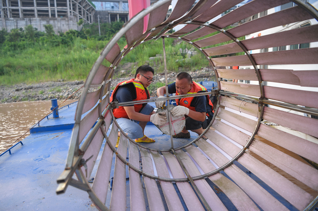下午6时,长江朝天门航道处寸滩航道维护基地,长江朝天门航道处处长曾科伟正在与航道工人们研究对附近一艘航标船的“营救”方案。该船在洪峰过境中由于被漂浮物勾挂导致冲离原有位置,卡在铜田坝水道中窑沟水域停泊的两艘大船之间。