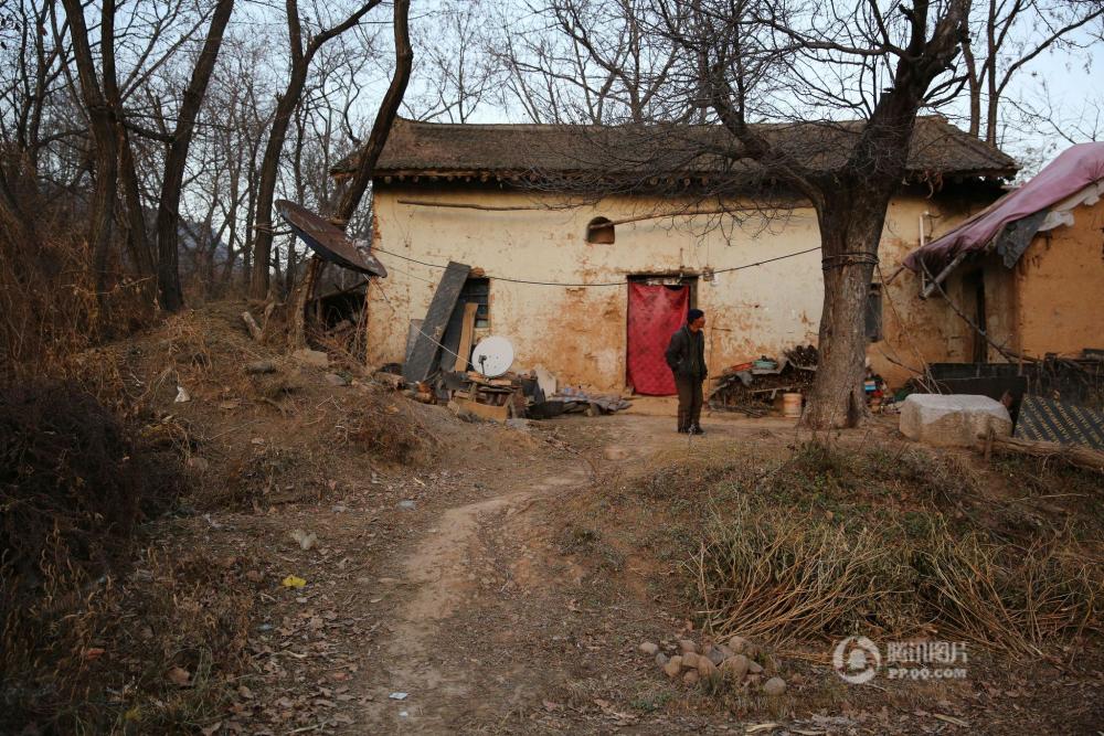 2016年12月7日,陕西省铜川市照金镇一个叫大岩子的山村里,76岁的郭文斌老人在山坡坡的土坯房前喂鸡,“养几只鸡就能把自己养活了。” 郭文斌老人说这话时很满足,他养了30只鸡。