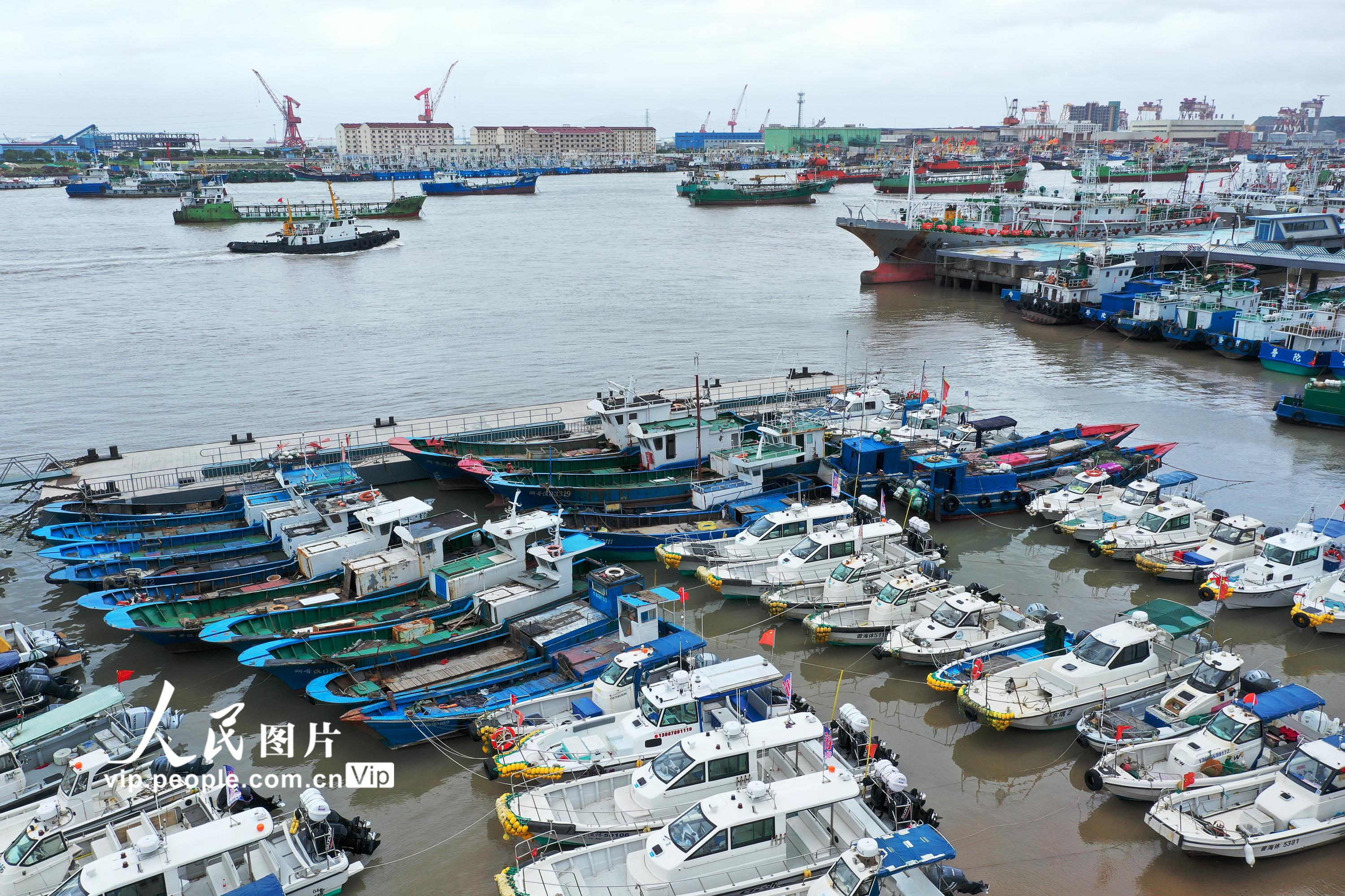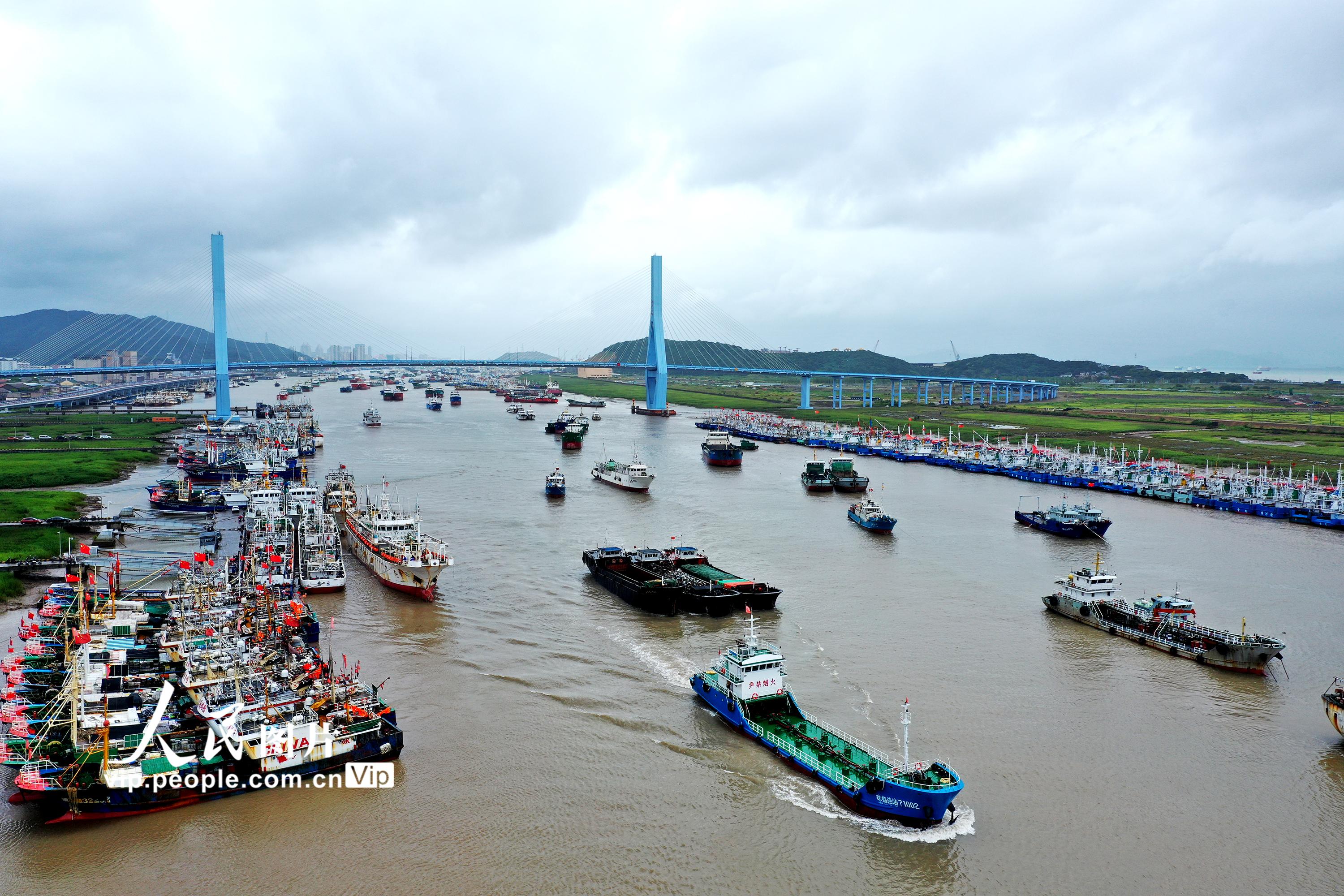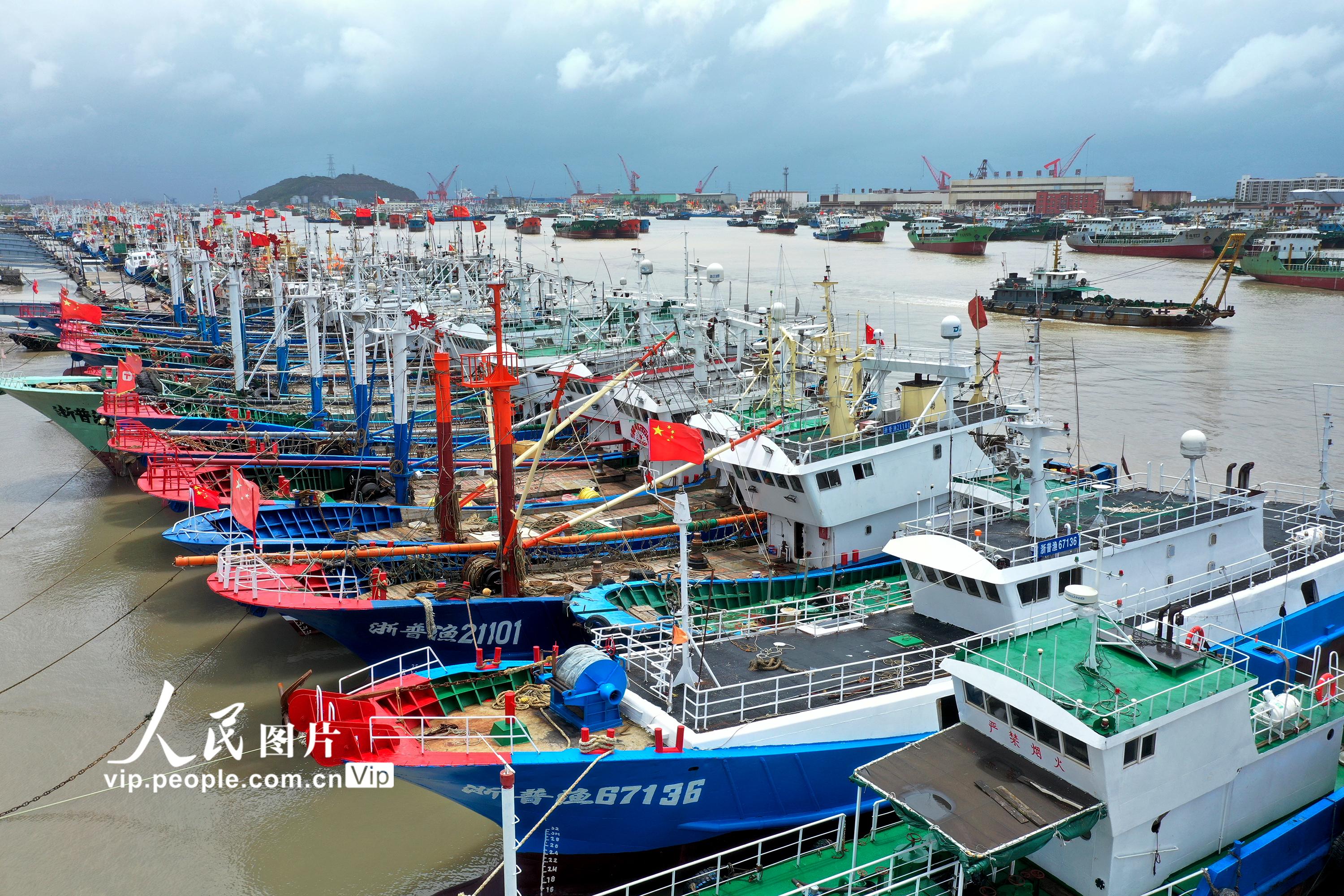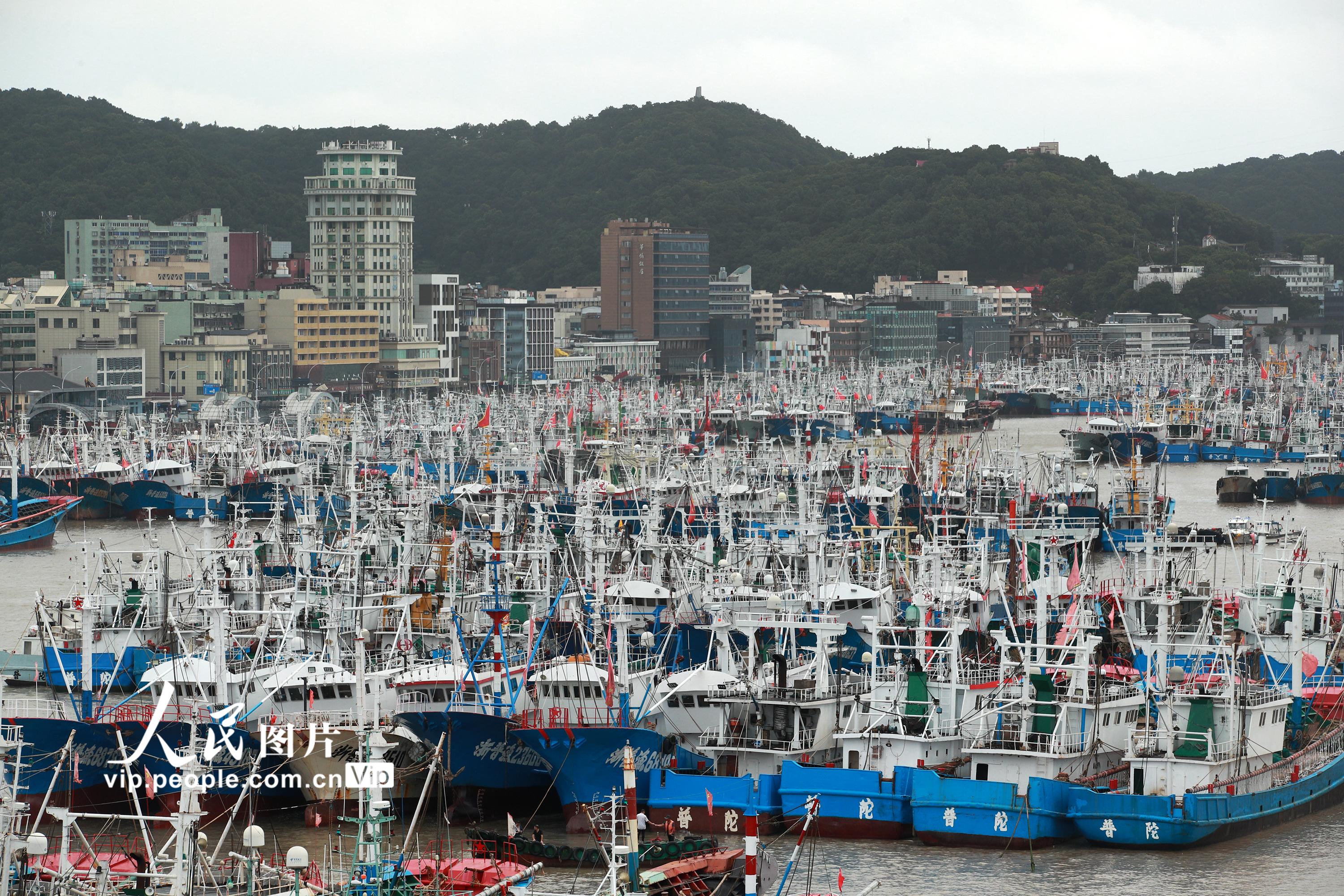 2021年7月22日上午,浙江省舟山市普陀区沈家门十里渔港内泊满了避“烟花”台风的各类渔船。舟山市气象台于当天15点钟发布的台风警报:今年第6号台风“烟花”(强台风级)14时中心位于舟山东南方向大约800公里的洋面上,近中心最大风力14级。据了解,根据科学避风要求,舟山全市5583艘渔船已全部到港避风。姚峰摄(人民图片网)