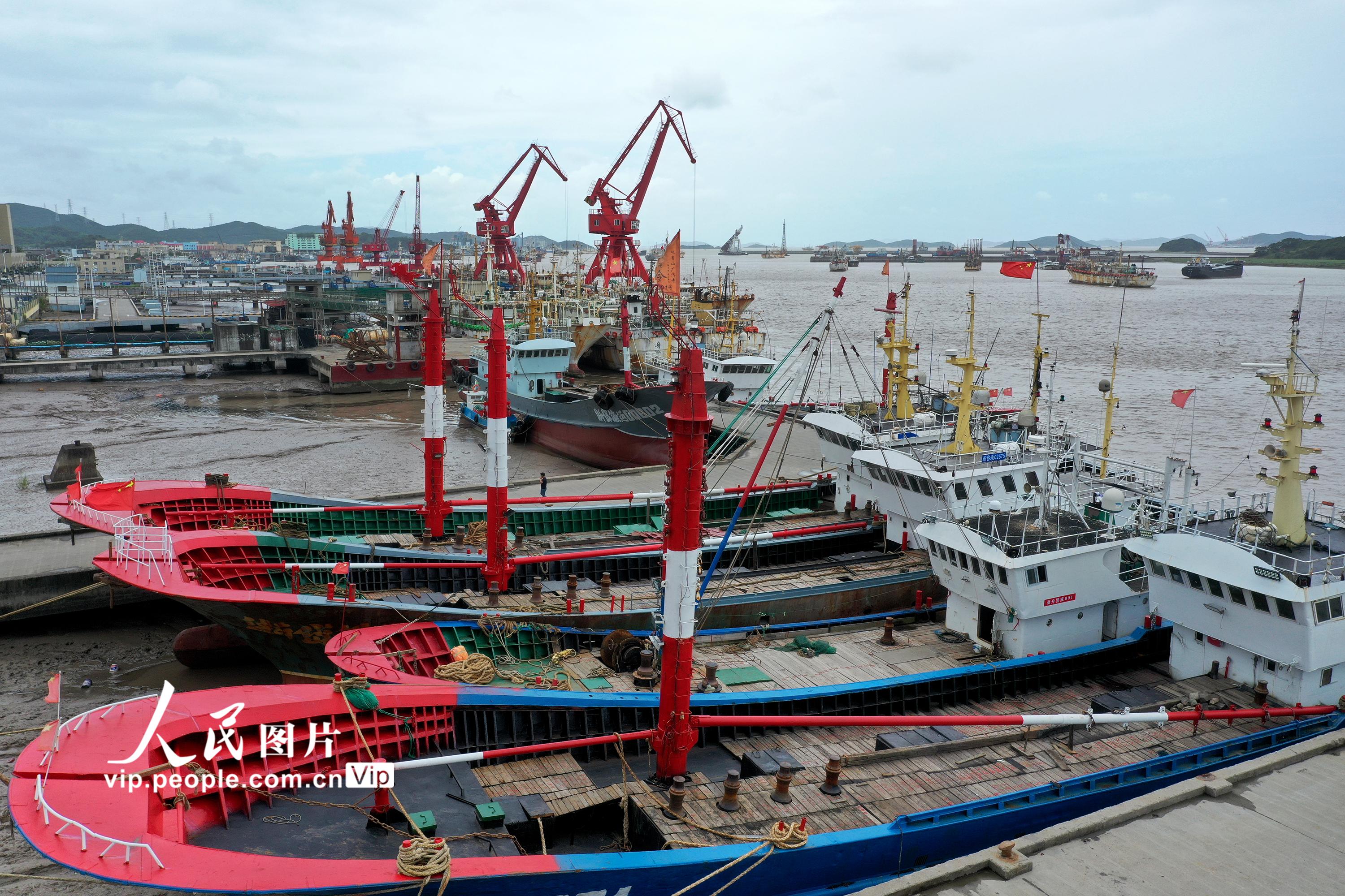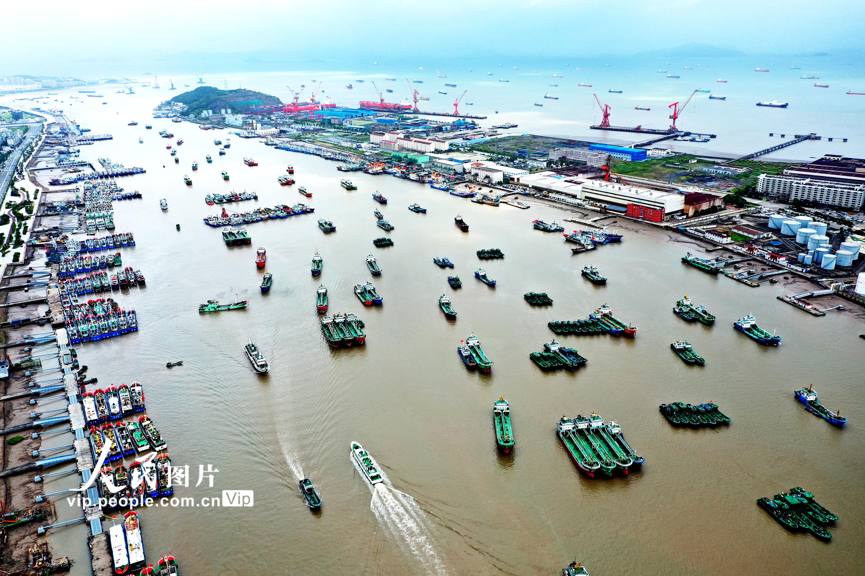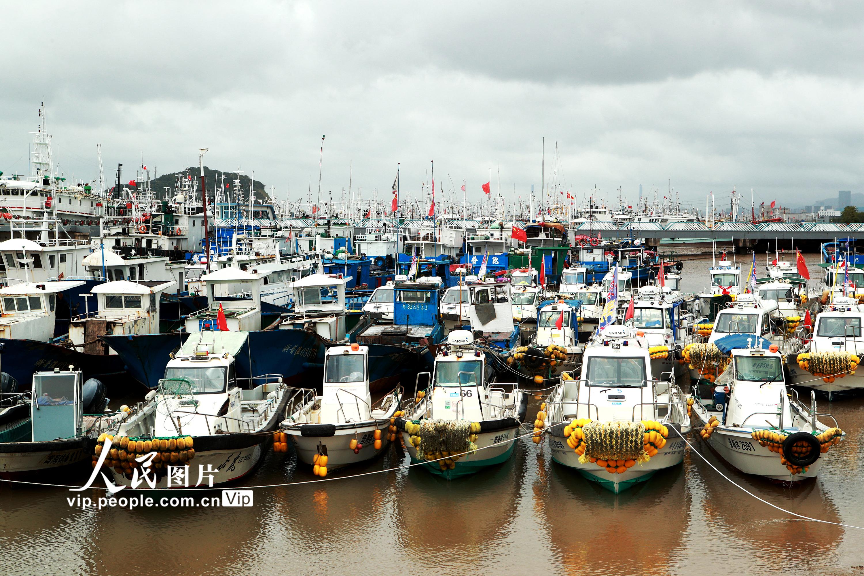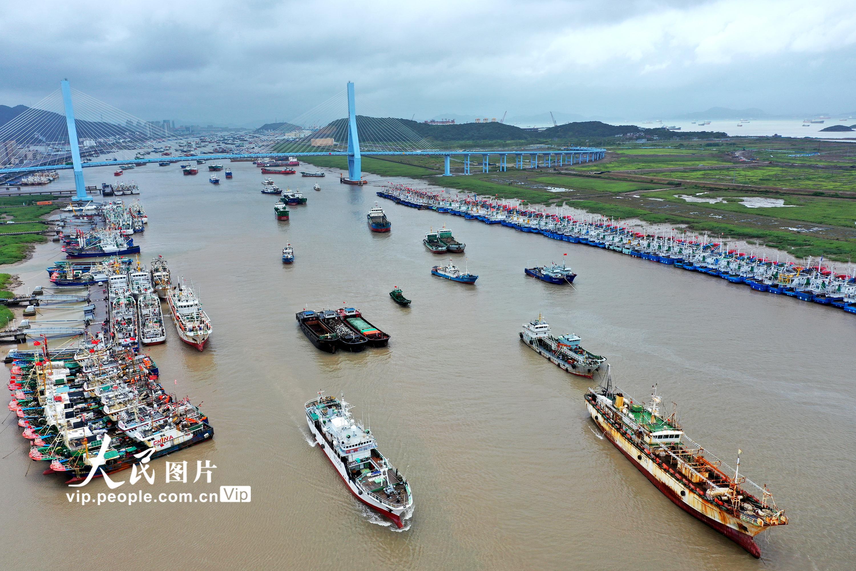 2021年7月22日上午,浙江省舟山市普陀区沈家门十里渔港内泊满了避“烟花”台风的各类渔船。舟山市气象台于当天15点钟发布的台风警报:今年第6号台风“烟花”(强台风级)14时中心位于舟山东南方向大约800公里的洋面上,近中心最大风力14级。据了解,根据科学避风要求,舟山全市5583艘渔船已全部到港避风。姚峰摄(人民图片网)
