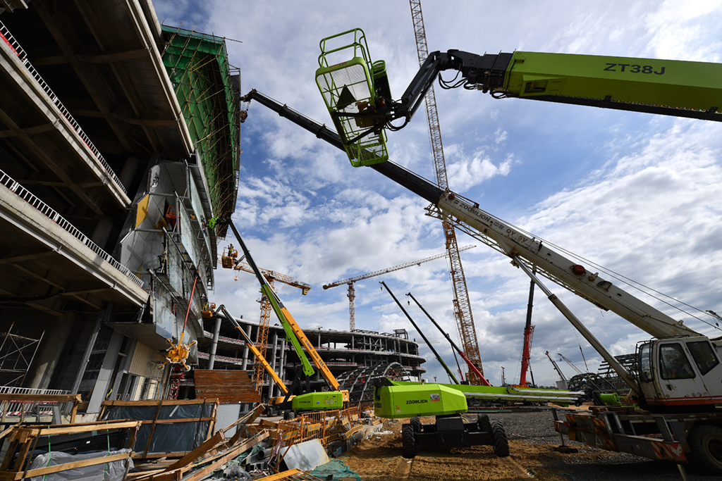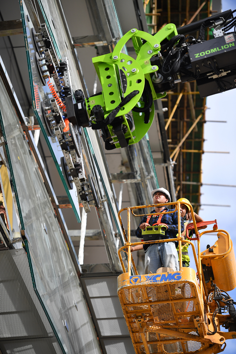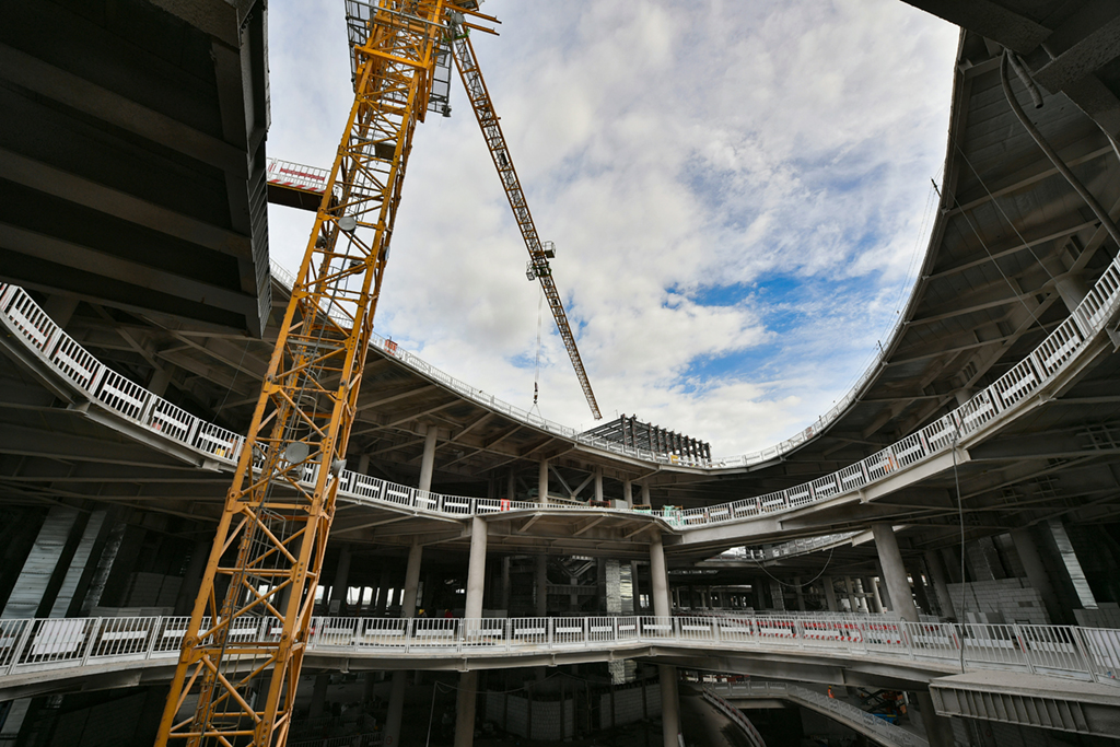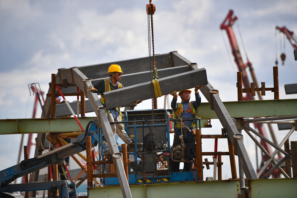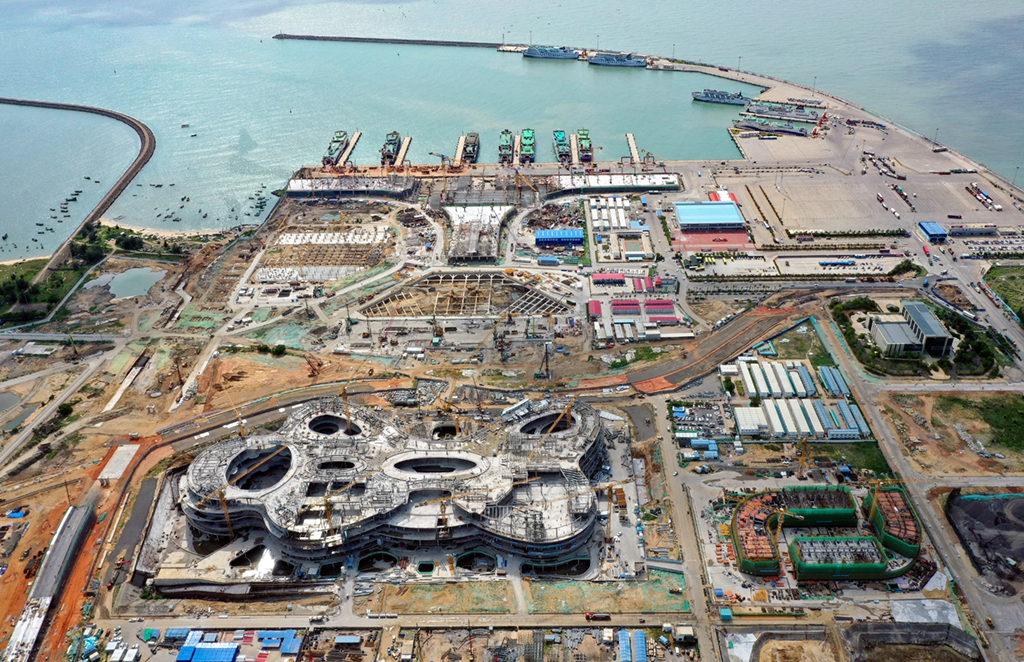 近日,海口国际免税城免税商业中心主体结构施工完毕,目前在进行玻璃幕墙及屋面网架结构样板施工。海口国际免税城项目总建筑面积约92.6万平方米,预计2022年正式营业。新华社记者 郭程 摄