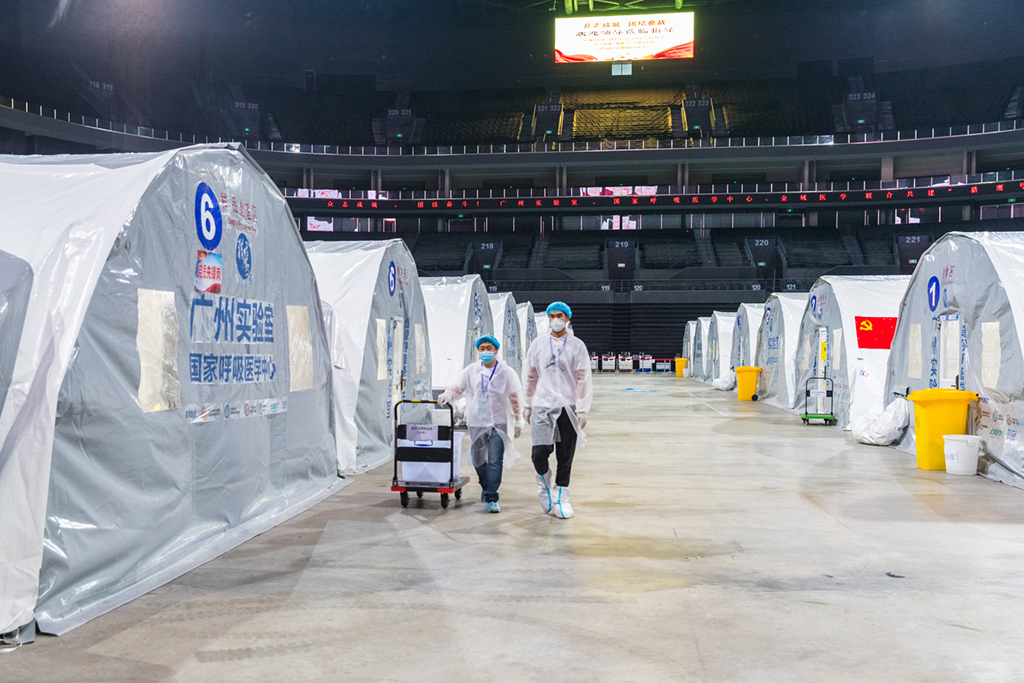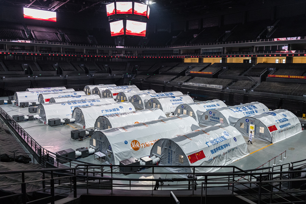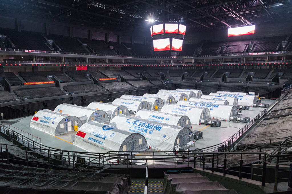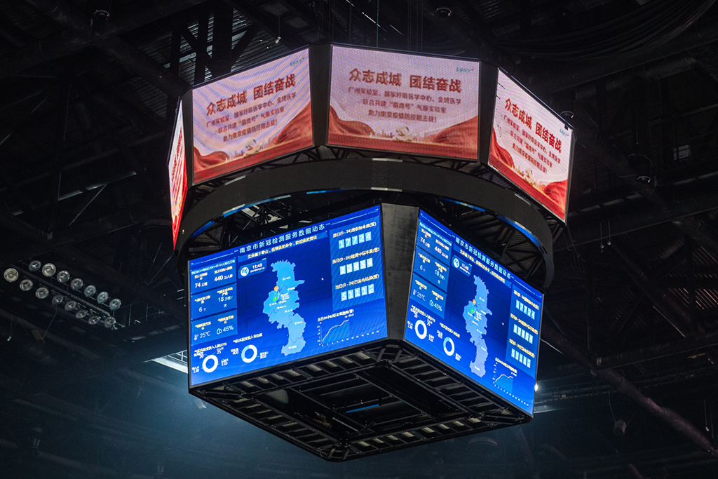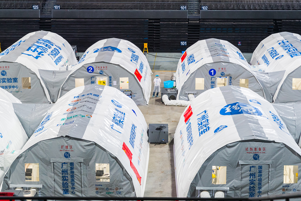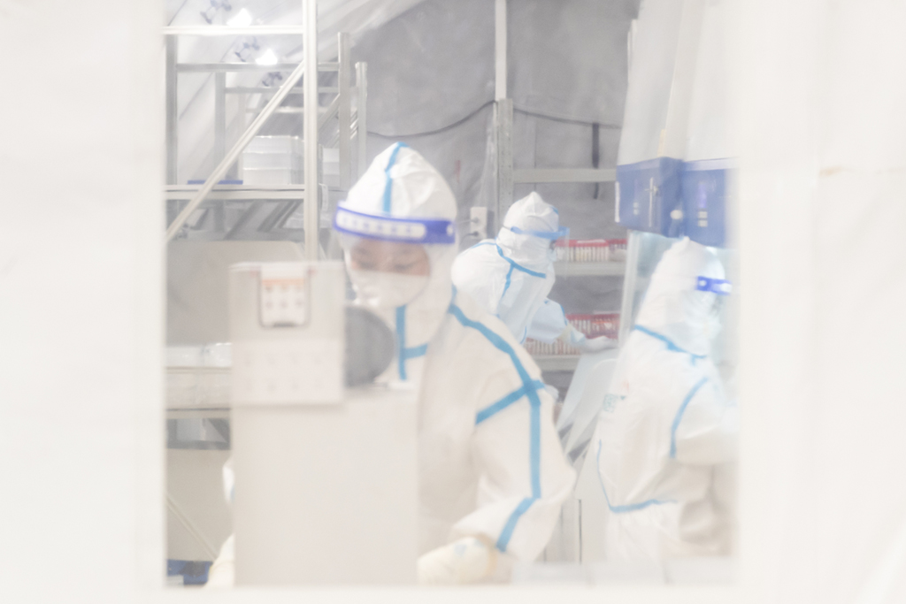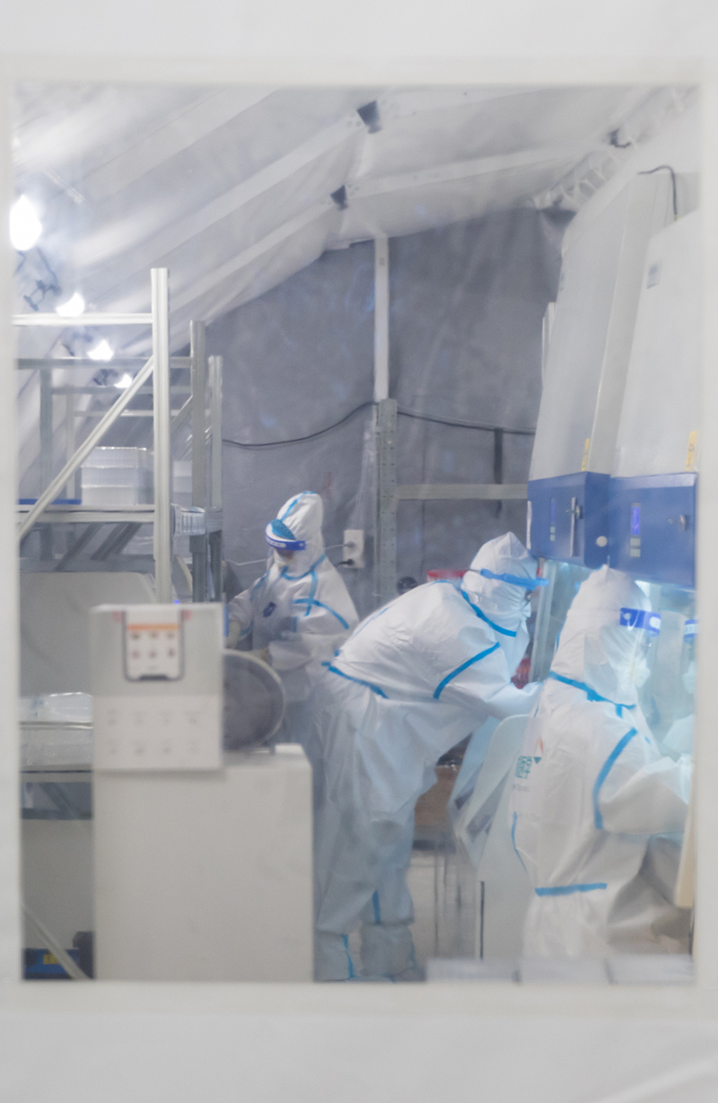 近期,南京江北新区青奥体育公园体育馆,已建成投用的“猎鹰号”气膜实验室正通宵运转,现场工作人员在负压实验室内紧张工作,对源源不断送来的咽拭子样本进行检测操作,日检测能力达180万人份。周文军摄(人民视觉)