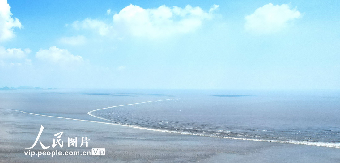 2021年8月8日是立秋后钱塘江第一个大潮汛日,潮水从杭州湾起潮,经嘉绍大桥向位于海宁尖山喇叭口挺进,潮势十分壮观。沈达摄(人民图片网)
