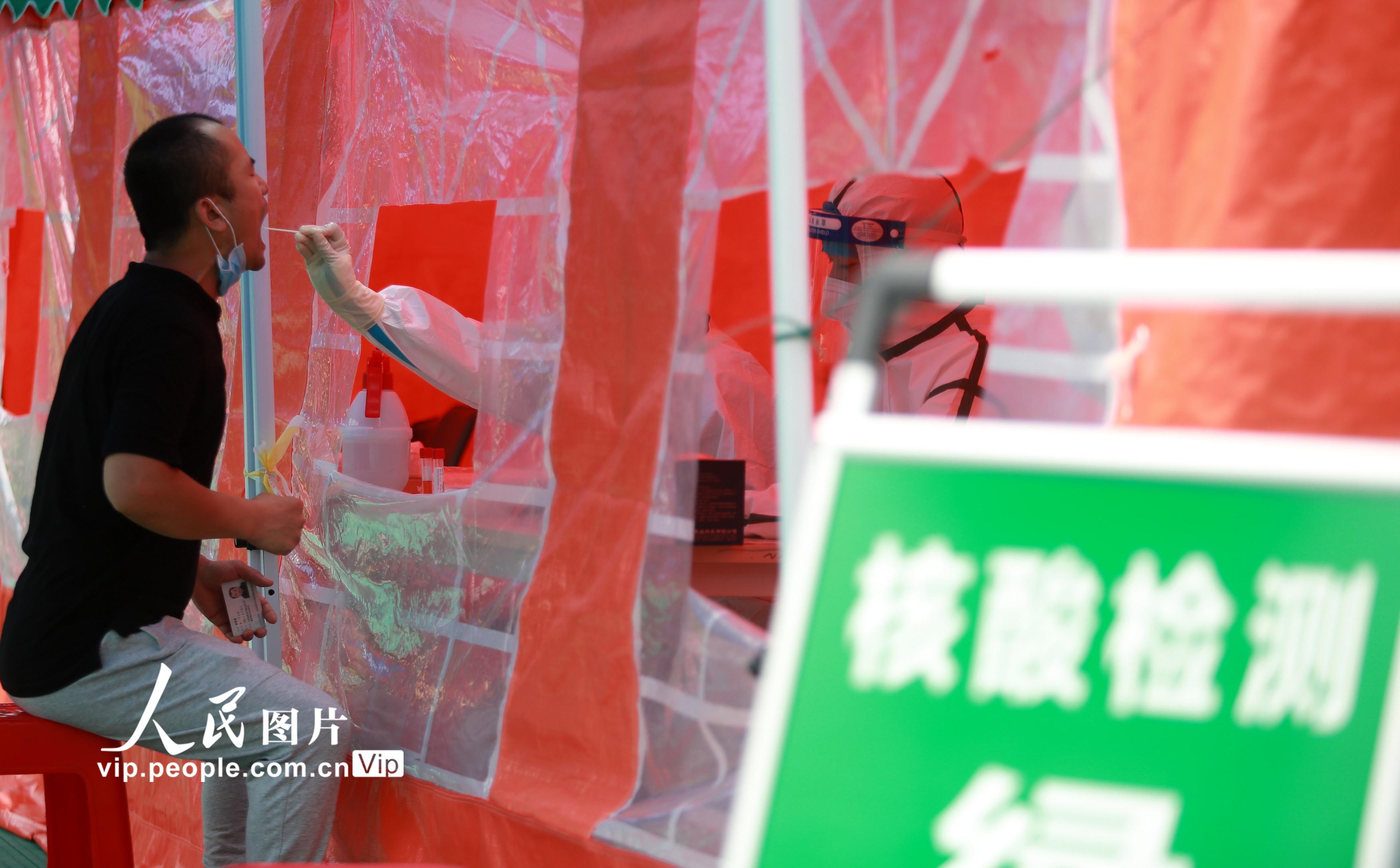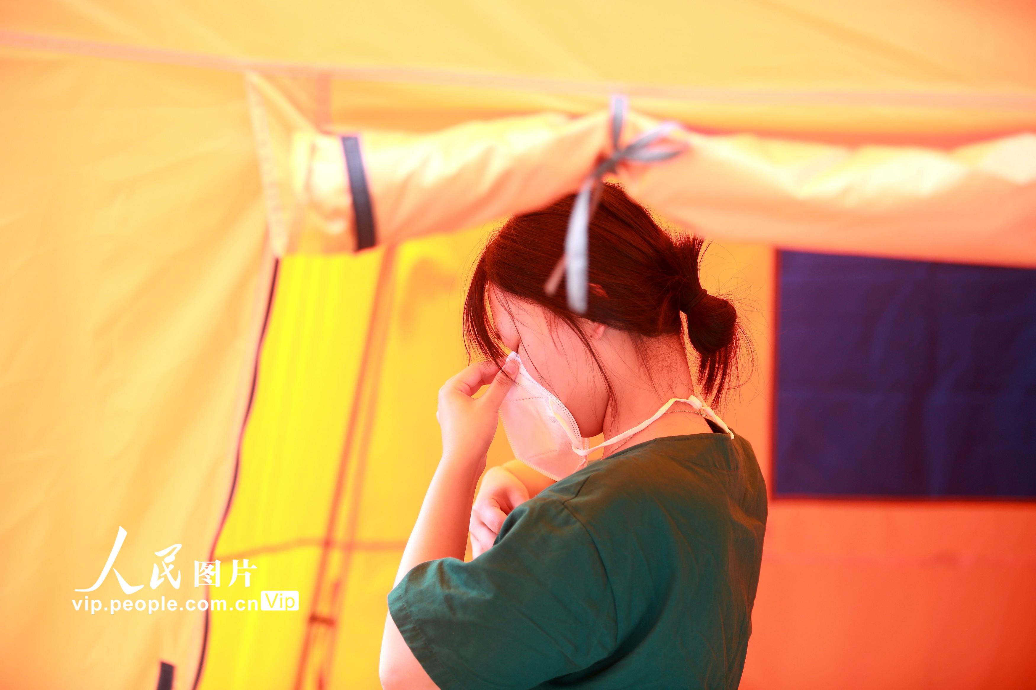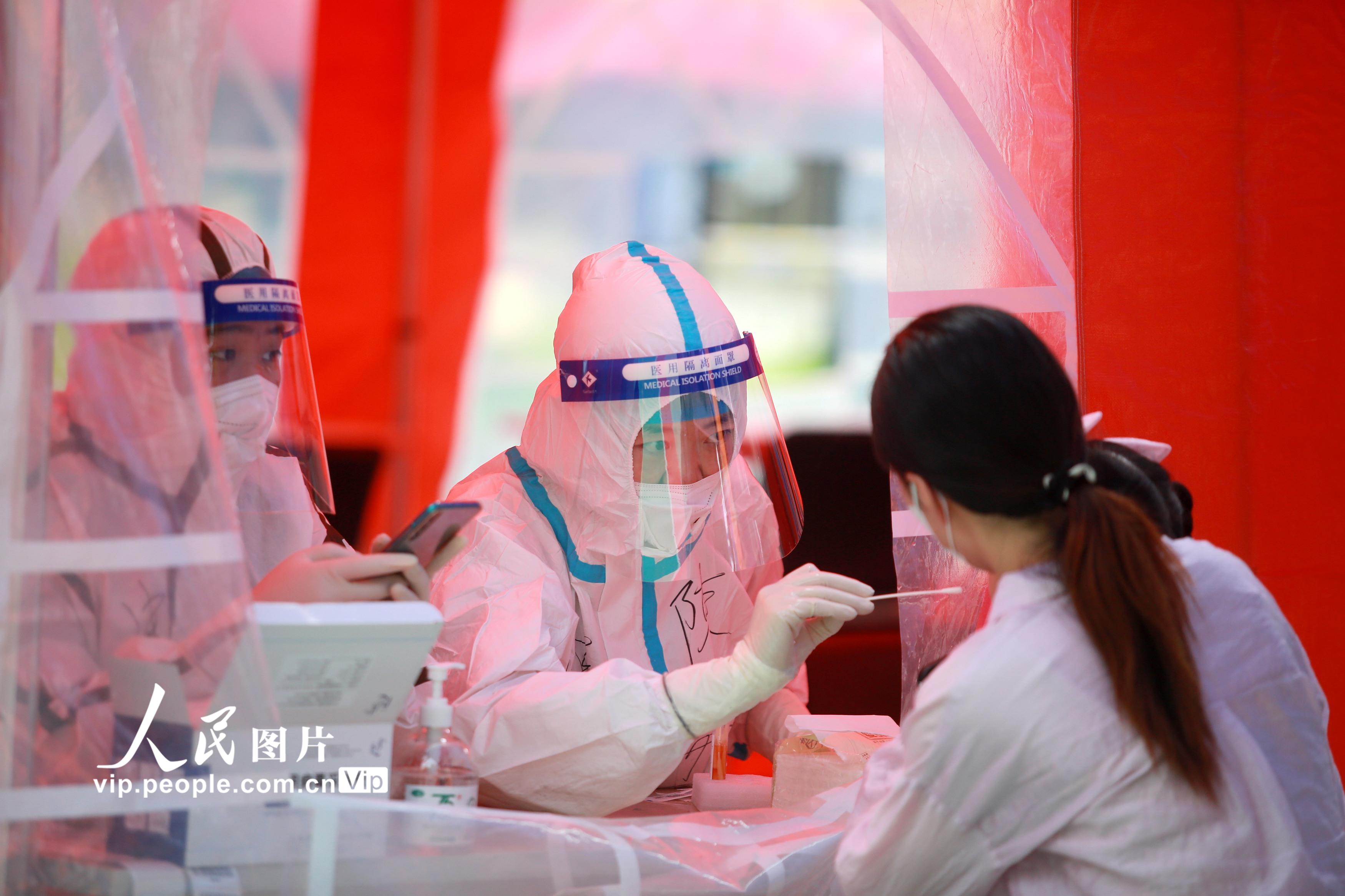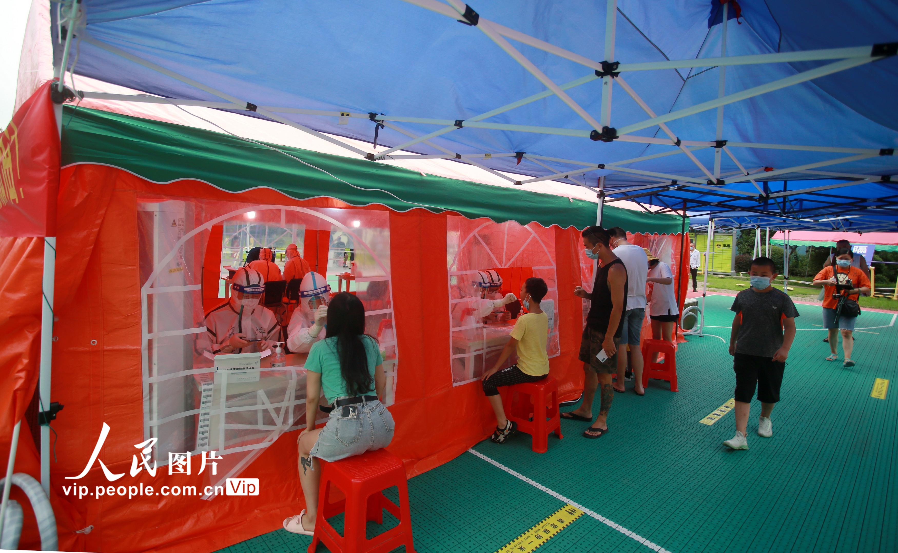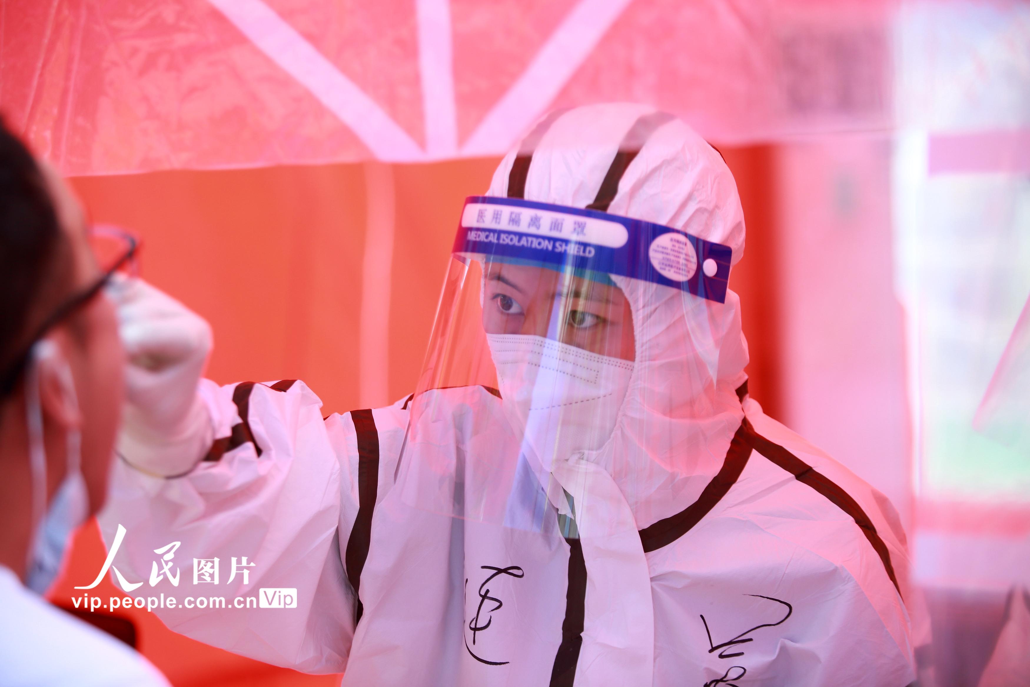 2021年8月11日,江苏省扬州市主城区开展第六轮大规模核酸检测,在江苏省扬州市邗江区竹西街道竹西社区的核酸检测点,各级医务人员紧急响应,冒着高温进行核酸检测工作,坚守在抗疫一线,默默为人民群众服务。孟德龙摄(人民图片网)