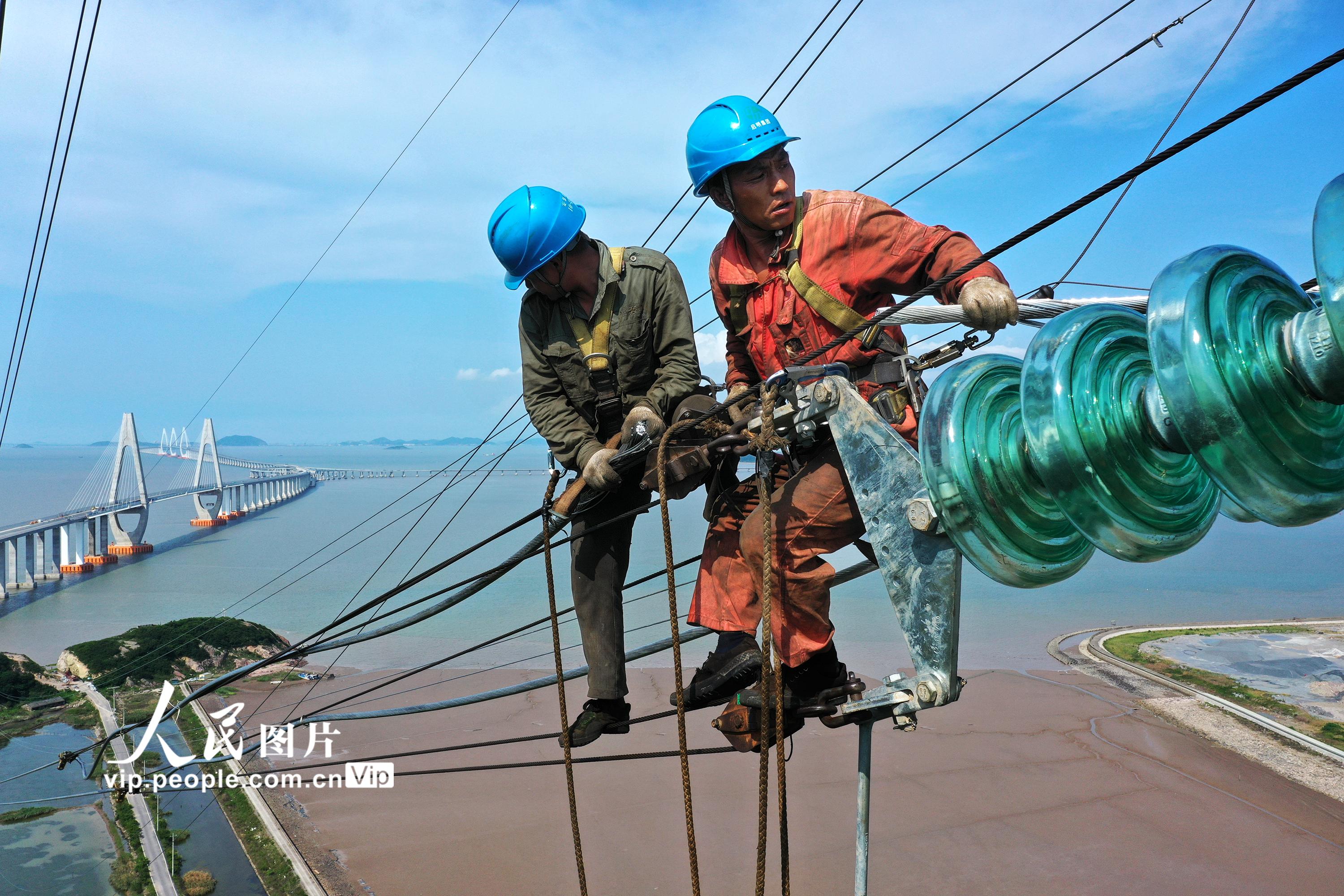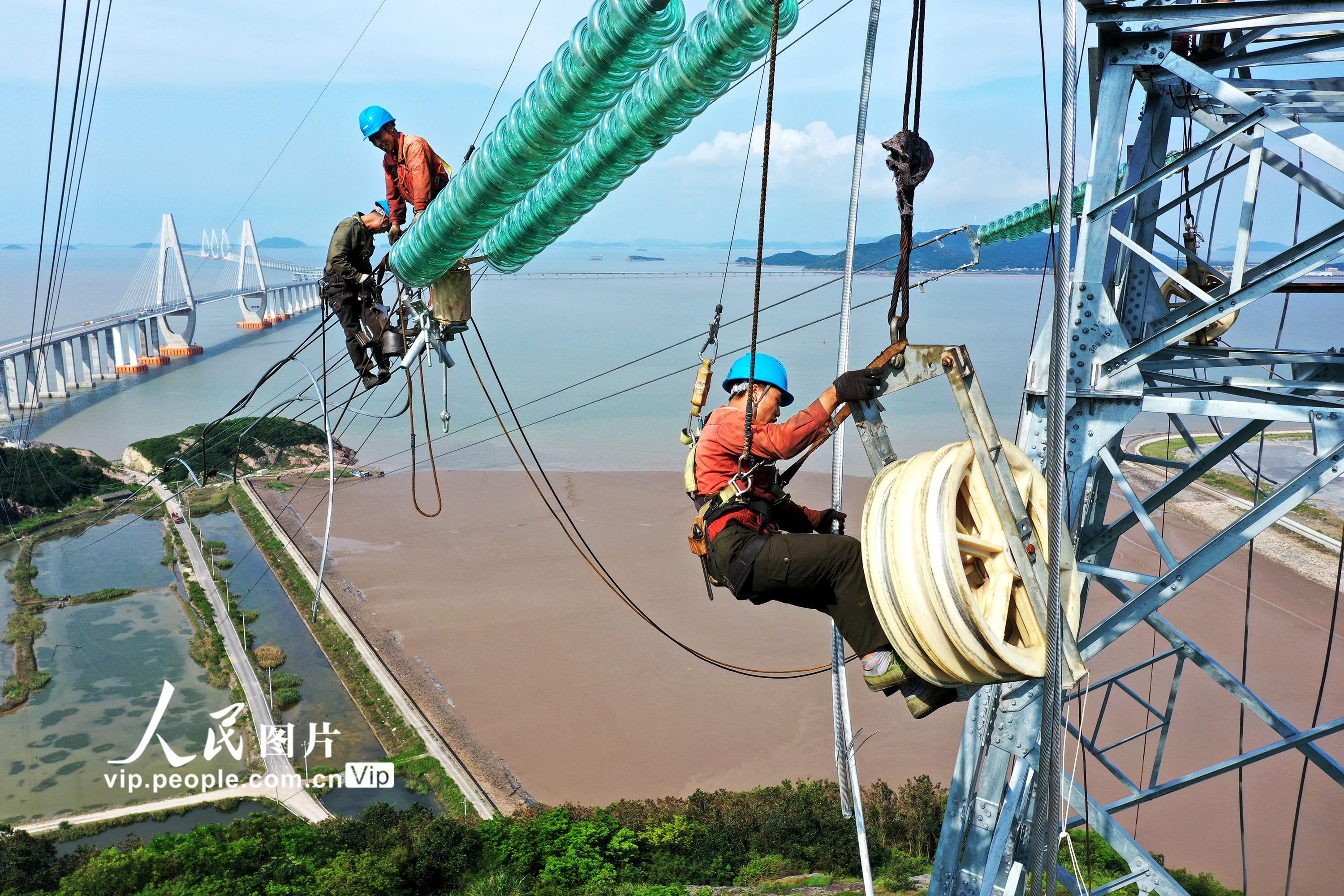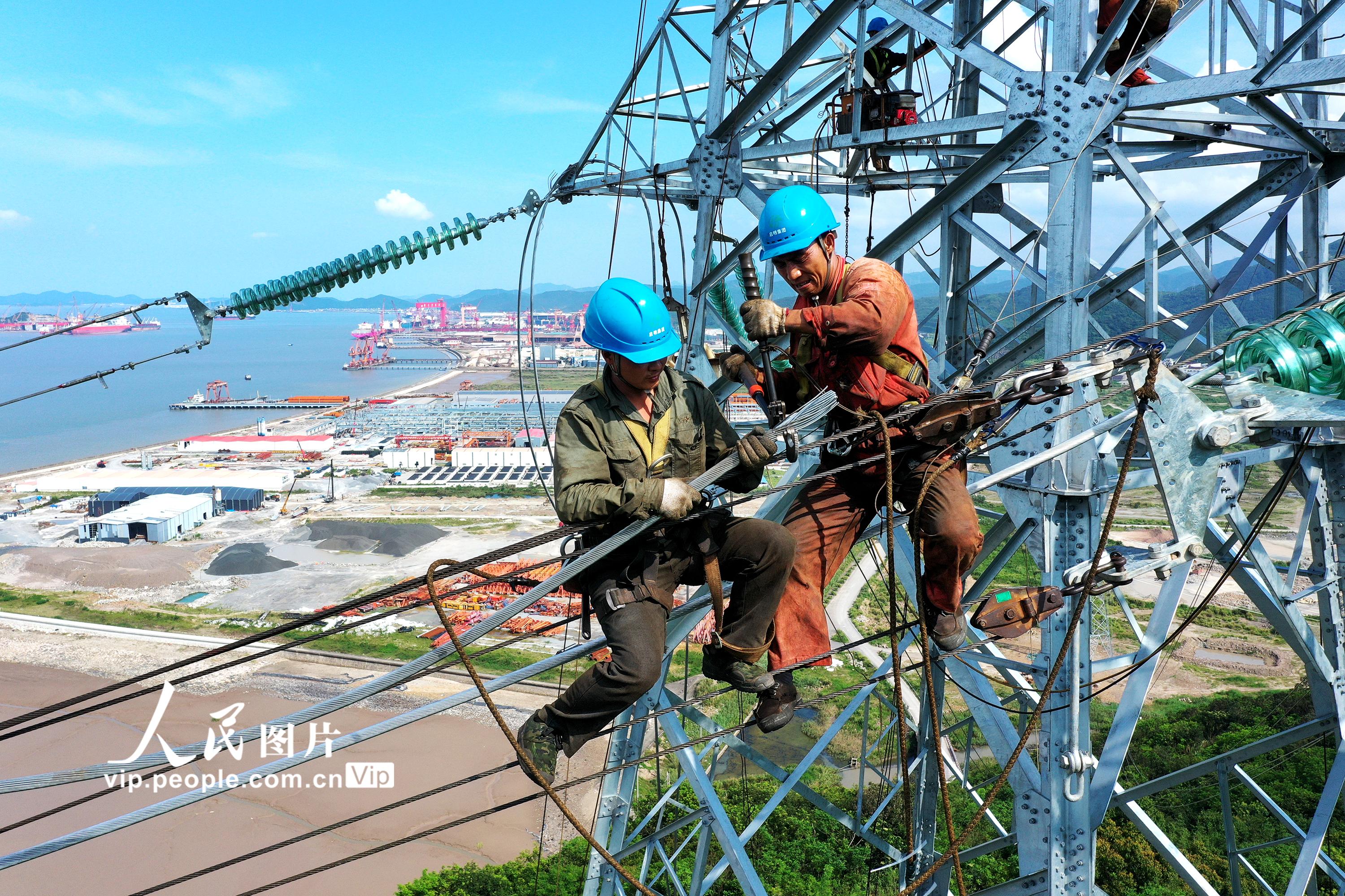 2021年8月18日,浙江省舟山市供电公司施工人员在高空中进行架线作业,此次施工的是舟山市洛迦——鱼东220千伏线路工程46号至55号塔。预计8月22日完成该段线路架设。姚峰摄(人民图片网)