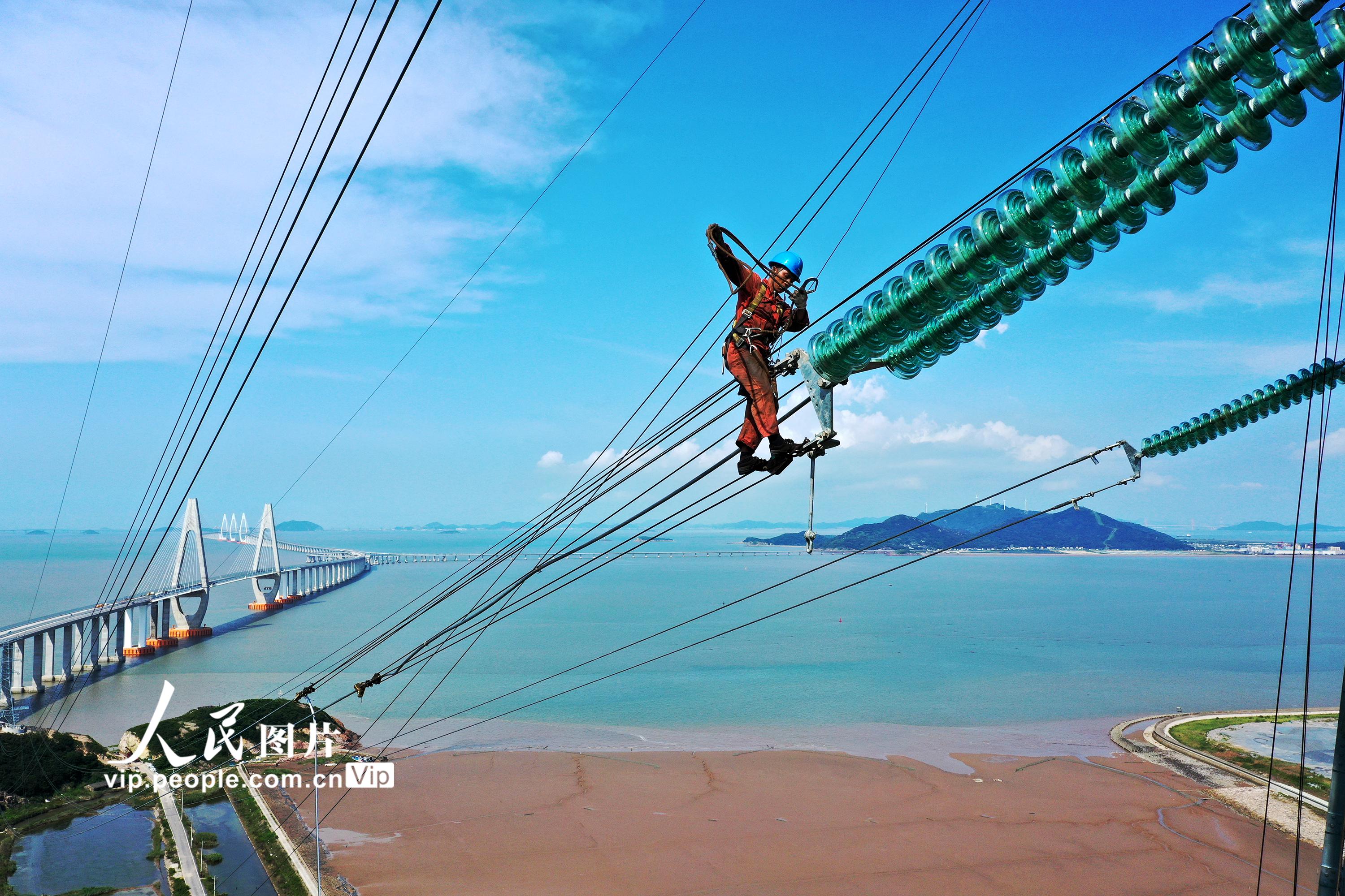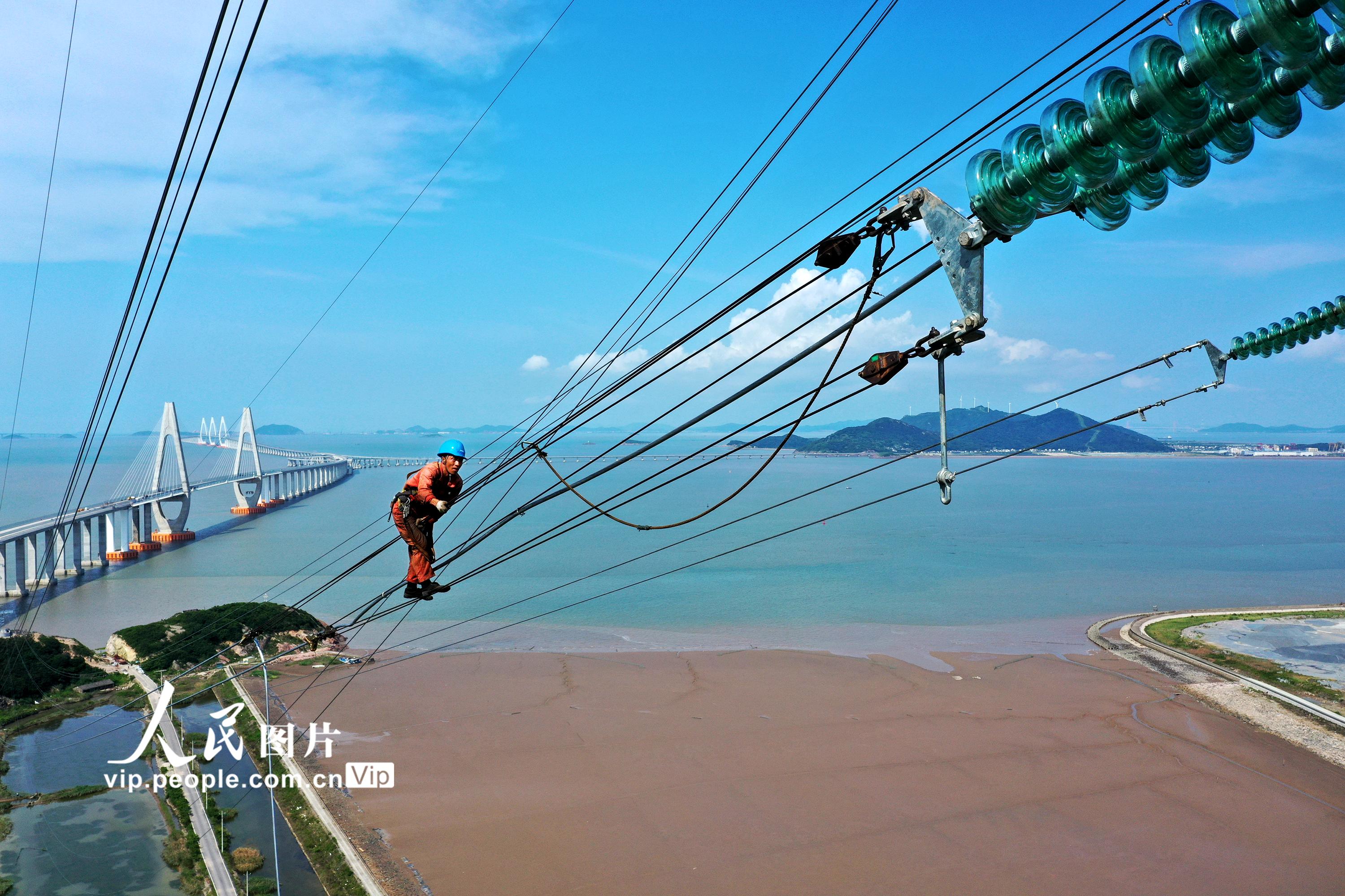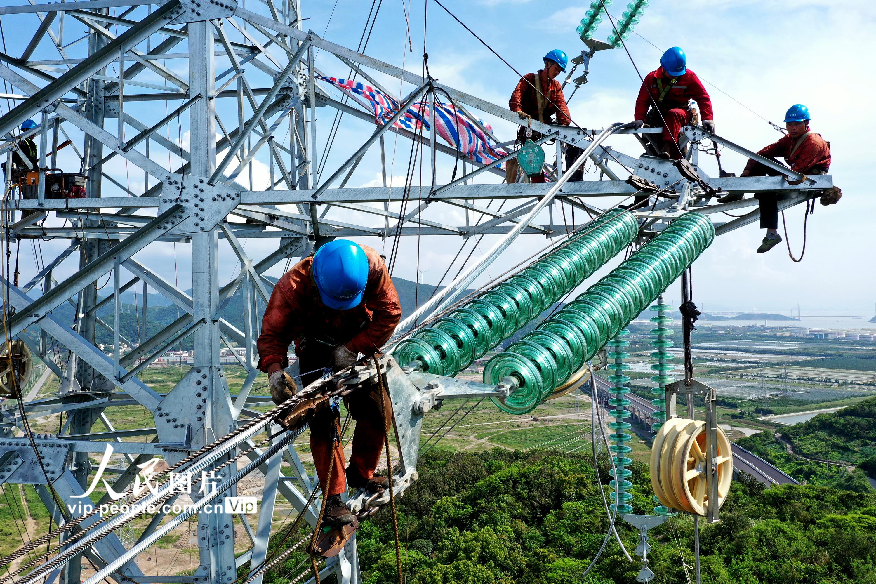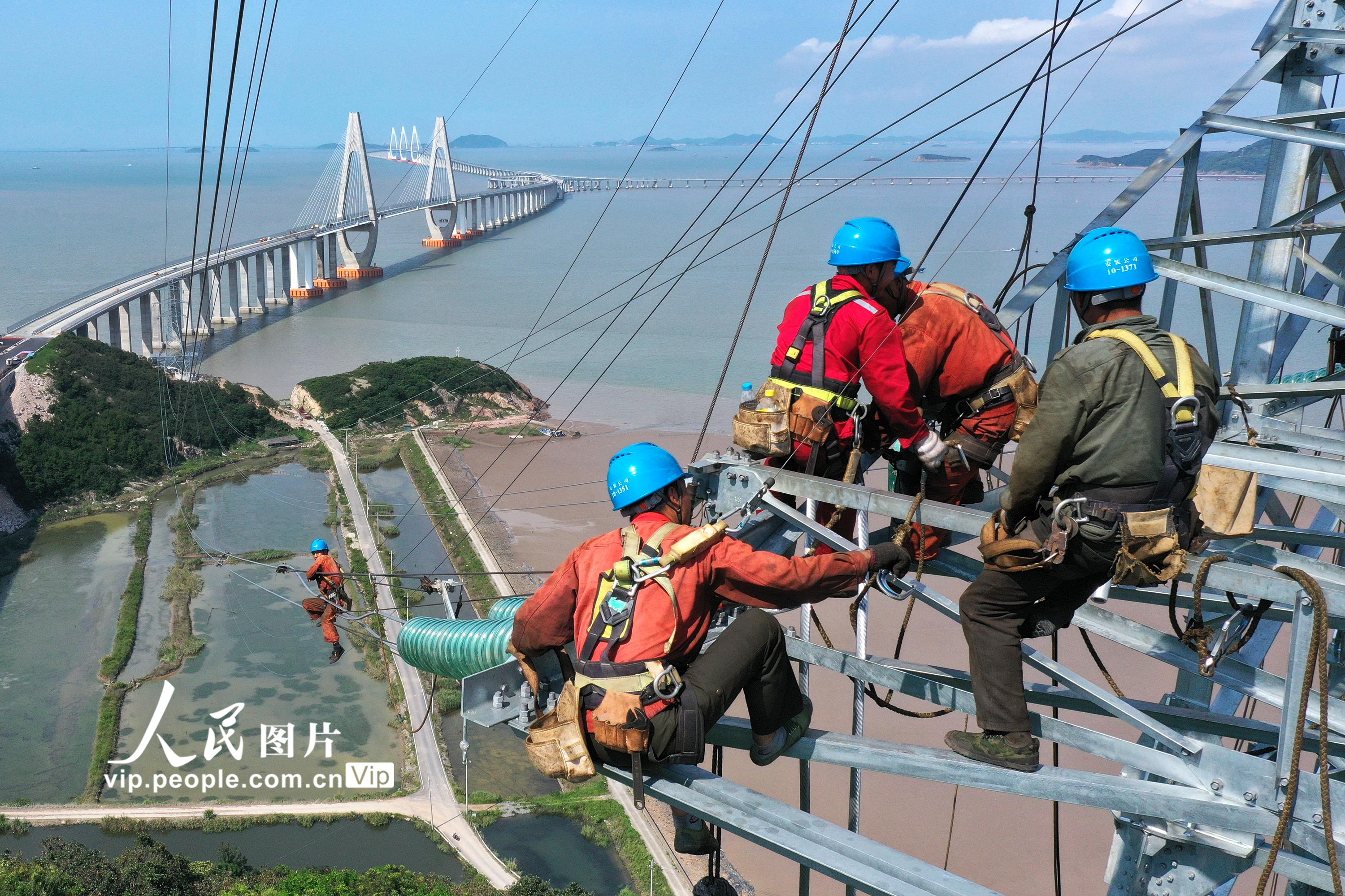 2021年8月18日,浙江省舟山市供电公司施工人员在高空中进行架线作业,此次施工的是舟山市洛迦——鱼东220千伏线路工程46号至55号塔。预计8月22日完成该段线路架设。姚峰摄(人民图片网)