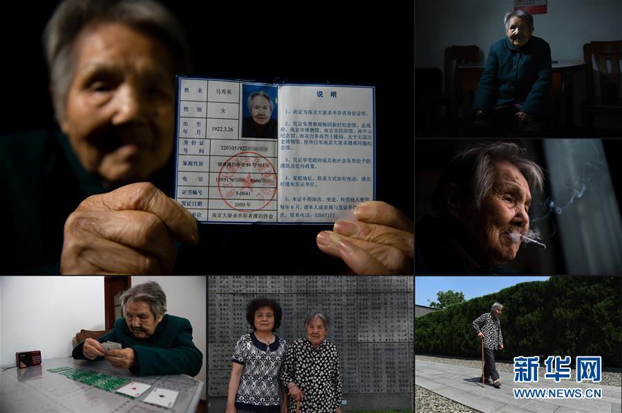 马秀英,1922年出生。1937年冬,家住南京汉中门附近南卫巷的马秀英一家遭难,18岁的三哥被日军拖上汽车带走,从此下落不明;马秀英与母亲逃进难民区后得以幸存。如今马秀英耳不聋、眼不花,腿脚还算利索,与儿子、儿媳生活在一起。马秀英展示自己的南京大屠杀幸存者证书(2016年11月18日摄)(左上);马秀英在南京家中(2016年11月18日摄)(右上);随着年龄增大,马秀英有时会抽上一支烟(2016年11月18日摄)(右中);马秀英在家中打牌打发时间(2016年11月18日摄)(下左);马秀英和儿媳孙秀英在侵华日军南京大屠杀遇难同胞纪念馆“哭墙”前合影(2016年6月17日摄)(下中);马秀英经常来侵华日军南京大屠杀遇难同胞纪念馆转转(2016年6月17日摄)(下右)。