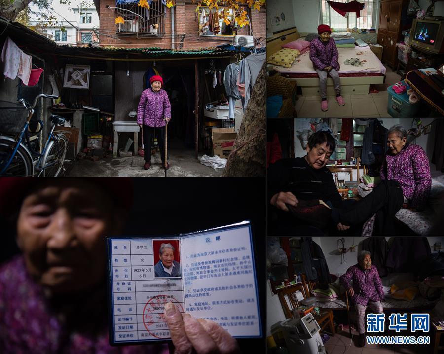 易翠兰,1923年5月6日生于南京老城南。1937年冬,易翠兰被家人在脸上涂满锅灰装扮成男孩,辗转在五台山难民区和金陵女子大学难民收容所避难。虽然最终从血泊中死里逃生,但她因遭日军用枪托殴打,落下终身病根,经常疼痛难忍。易翠兰在南京临时租住处门前(2016年11月25日摄)(左上);易翠兰展示自己的南京大屠杀幸存者证书(2016年11月25日摄)(左下);易翠兰在南京临时租住的家中(2016年11月25日摄)(右上);易翠兰儿子陶盛福在帮助老人穿戴衣物(2016年11月25日摄)(右中);易翠兰经常依靠制氧机缓解呼吸困难的病症(2016年11月25日摄)(右下)。