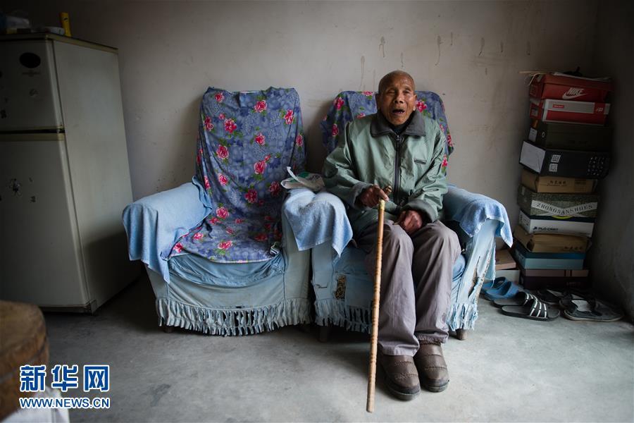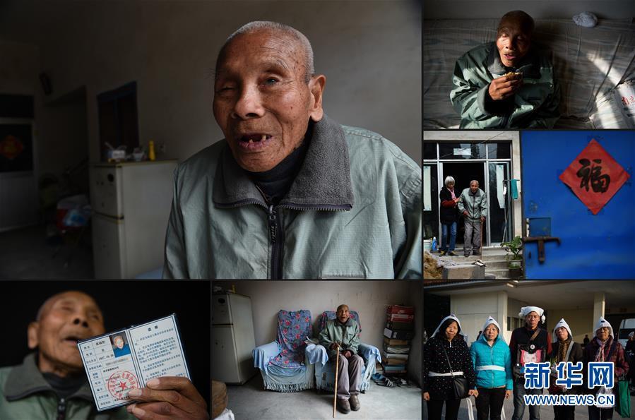 张福智,1927年10月出生。1937年冬,张福智和父亲在家中遭闯入的日军毒打,张福智右眼被打伤,后感染失明。老人于2016年11月26日去世。失明多年的张福智认不出身边的亲人,不记得已经吃过饭,走路颤颤巍巍且只有一个方向(2016年11月16日摄)(左上);张福智不停地向家人要东西吃(2016年11月16日摄)(右上);女儿张寿云偶尔搀扶老人出门晒晒太阳(2016年11月16日摄)(右中);张福智展示自己的南京大屠杀幸存者证书(2016年11月16日摄)(下左);坐在沙发里的张福智嘴中常常念念有词,不知在说些什么(2016年11月16日摄)(下中);老人去世后,子女们为他送殡(2016年11月28日摄)(下右)。