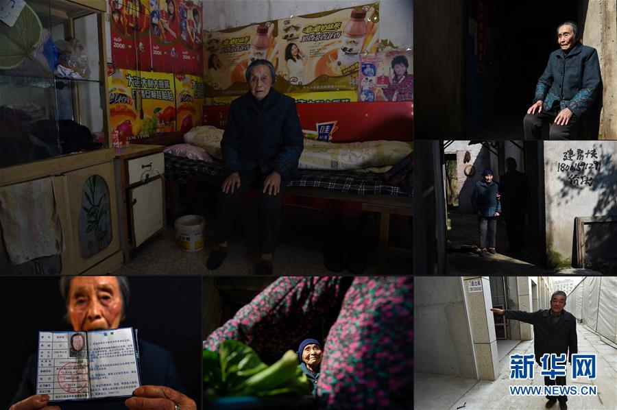 祝四孜,1920年6月3日出生。1937年冬,祝四孜居住的南京珠江镇西门外朱庄村遭日军洗劫,她家8间瓦房全被烧毁,她和家人藏在屋后菜园地洞内躲过一劫。祝四孜在自己卧室中(2016年11月3日摄)(左上);祝四孜在自家门口晒太阳(2016年11月3日摄)(右上);祝四孜在儿子的搀扶下出门散步(2016年11月3日摄)(右中);祝四孜展示自己的南京大屠杀幸存者证书(2016年11月3日摄)(下左);祝四孜和洗菜路过的村邻聊天(2016年11月3日摄)(下中);祝四孜儿子伏宝鑫指认当年老人避难的地方,现在已成为商家的门面房(2016年11月3日摄)(下右)。