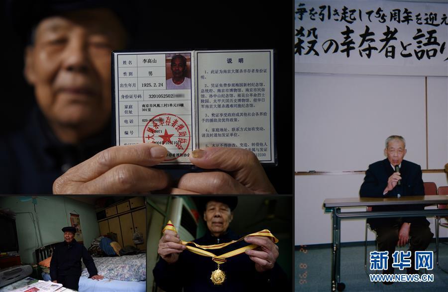 李高山,1925年出生于广东茂名。1937年冬,只有十三岁的李高山作为士兵参加了南京保卫战,被日军抓捕后死里逃生。如今老人与儿子住在一起,七八年前患脑梗后腿脚不便,患有老年性耳聋,但很健谈。李高山展示自己的南京大屠杀幸存者证书(2016年11月21日摄)(左上);李高山在南京家中(2016年11月21日摄)(左下);李高山展示自己的抗战胜利70周年纪念章(2016年11月21日摄)(下中);1996年12月,李高山赴日证言,揭露当年侵华日军犯下的罪行(右)(李高山提供,翻拍照片)。