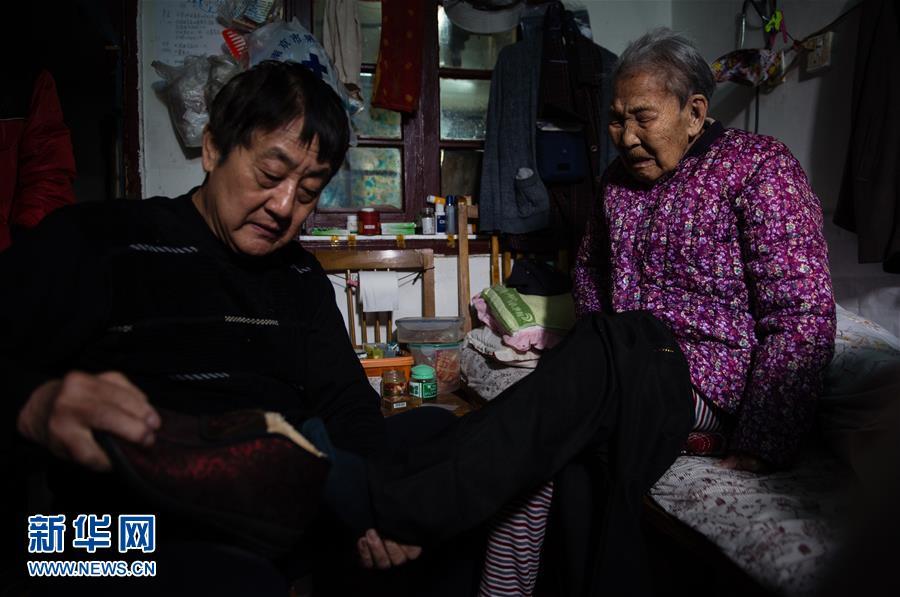 易翠兰的儿子陶盛福在帮助老人穿戴衣物(11月25日摄)。新华社记者 李响 摄