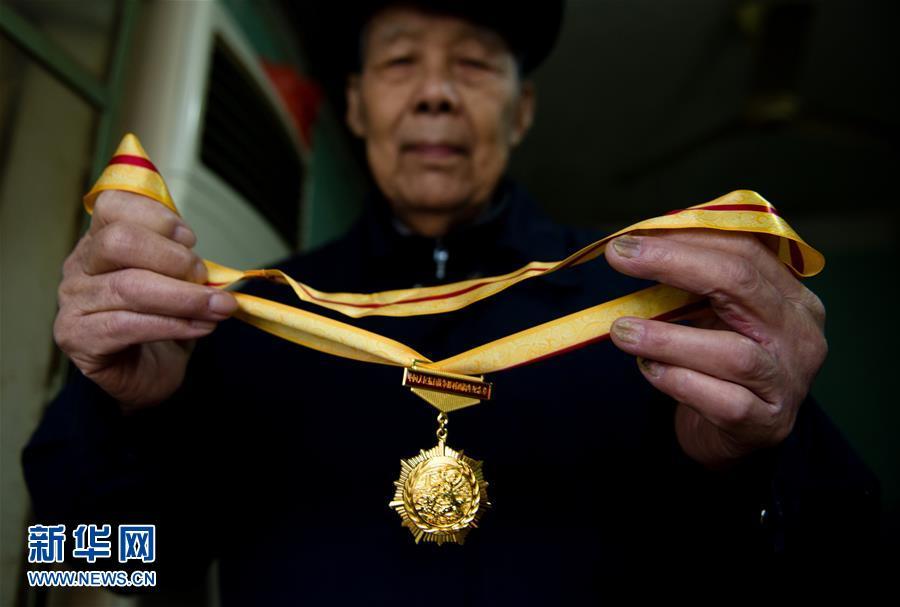 李高山展示自己的抗战胜利70周年纪念章(11月21日摄)。新华社记者 李响 摄