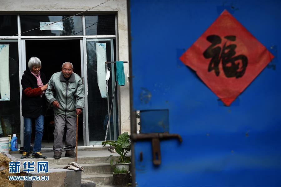 张福智老人生前在女儿张寿云的搀扶下出门晒太阳(11月16日摄)。张福智,1927年10月出生。1937年冬,张福智和父亲在家中遭闯入的日军毒打,张福智右眼被打伤,后感染失明。老人于2016年11月26日去世。