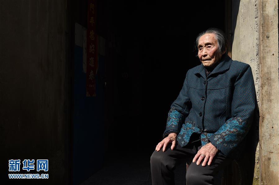 祝四孜在自家门口晒太阳(11月3日摄)。祝四孜,1920年6月3日出生。1937年冬,祝四孜居住的南京珠江镇西门外朱庄村遭日军洗劫,她家8间瓦房全被烧毁,她和家人藏在屋后菜园地洞内躲过一劫。