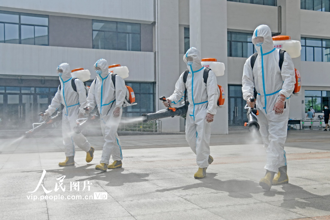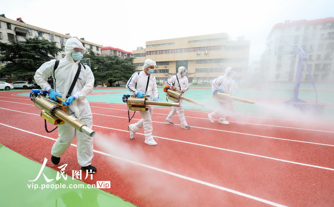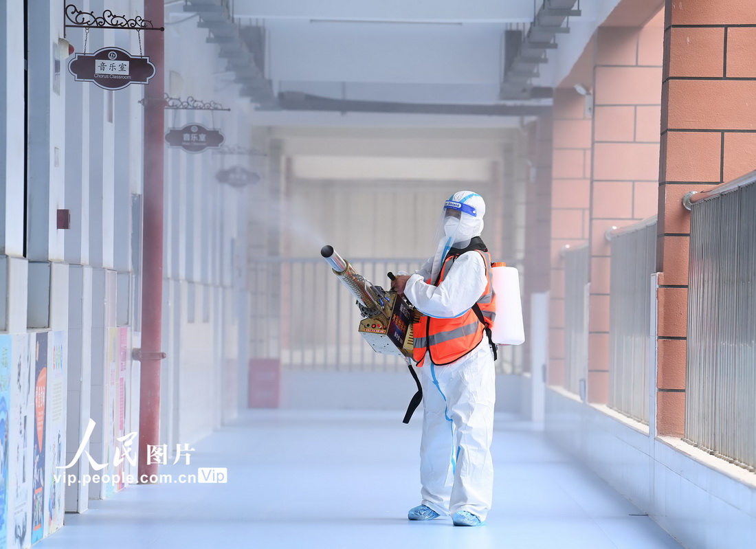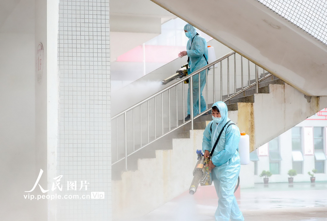 图五、图六 为了给即将返校的学生营造卫生整洁、安全有序的校园环境,2021年8月25日,武汉市光谷第十二小学邀请专业人员,对校园内学生活动场所及教室内外进行了消毒。张璨龙摄(人民图片网)
