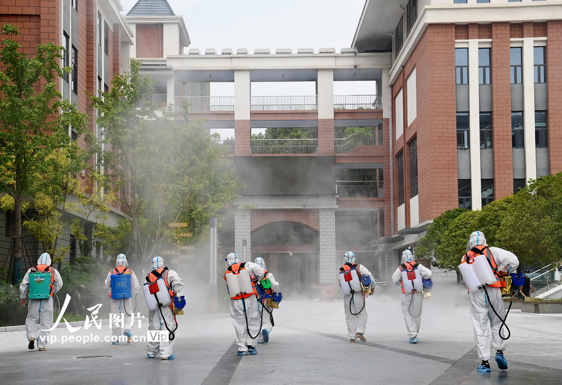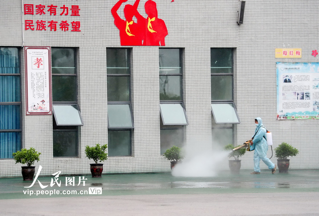 图三、图四 秋季开学在即,四川省华蓥市义务工作者协会及时组织义工连续对华蓥中学、红军小学、清溪路幼儿园等城区中小学校及幼儿园进行全面消毒杀菌,构筑疫情防控防护网,切实有效保障新学期师生的身体健康与生命安全。邱海鹰摄(人民图片网)