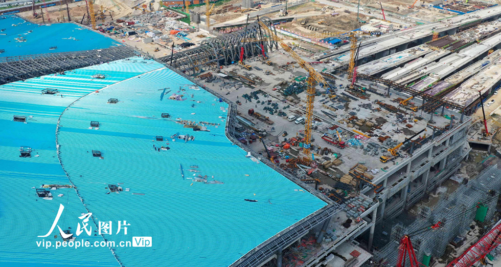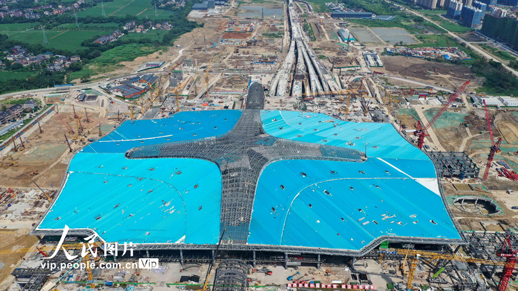 作为2022年杭州亚运会的重点交通保障工程,杭州西站枢纽总建筑面积约51万平方米,是我国大型铁路枢纽之一,采用站城融合一体化设计。目前,站房屋面闭水工程即将完成,枢纽标志性建筑“云门”已开工建设,雨棚上盖开发项目、杭州西动车所盖板项目等工程有序推进。谢尚国摄(人民图片网)