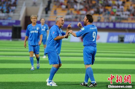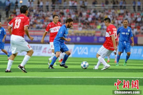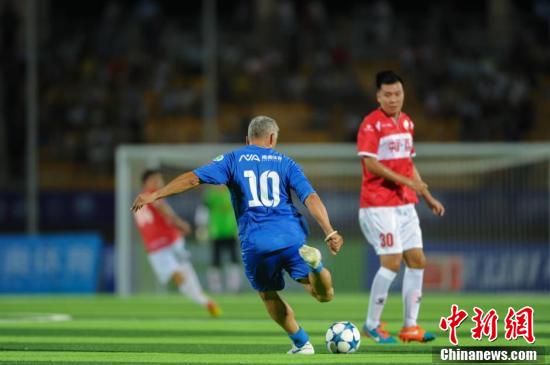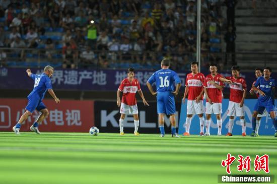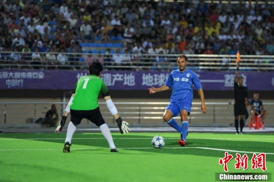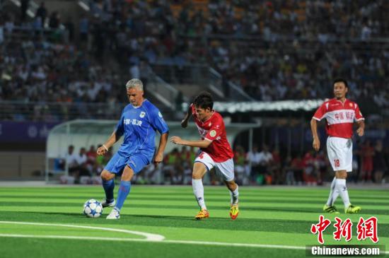 7月19日晚,意大利传奇巨星队球员罗伯特·巴乔(Roberto Baggio)(右)在比赛中。 当日,在贵州省荔波县举行的“2016意大利传奇巨星中国行”荔波站比赛中,中国元老明星足球队以3比2战胜意大利传奇巨星队。 中新社记者 贺俊怡 摄