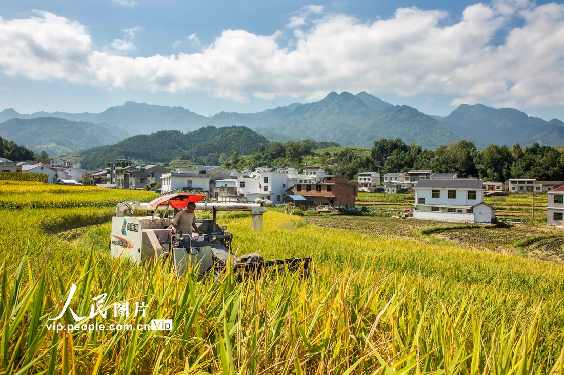湖北省十堰市竹溪县30余万亩稻谷进入抢收高峰期,当地农民抢抓晴好天气收割、整理晾晒稻谷归仓。温大树摄(人民图片网)