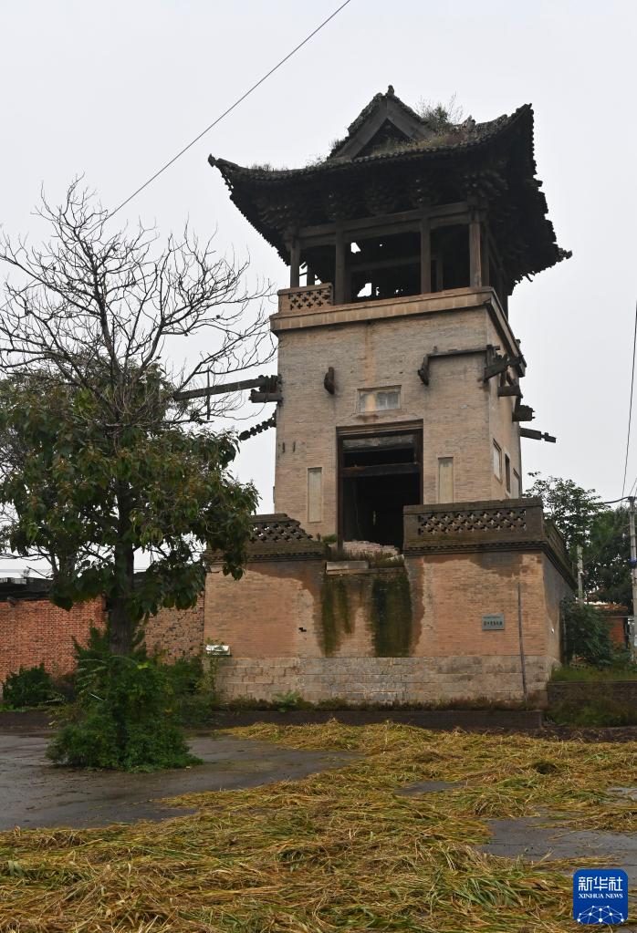 全国重点文物保护单位山西省汾城古建筑群的城隍庙一处建筑檐部瓦件脱落(10月12日摄)。