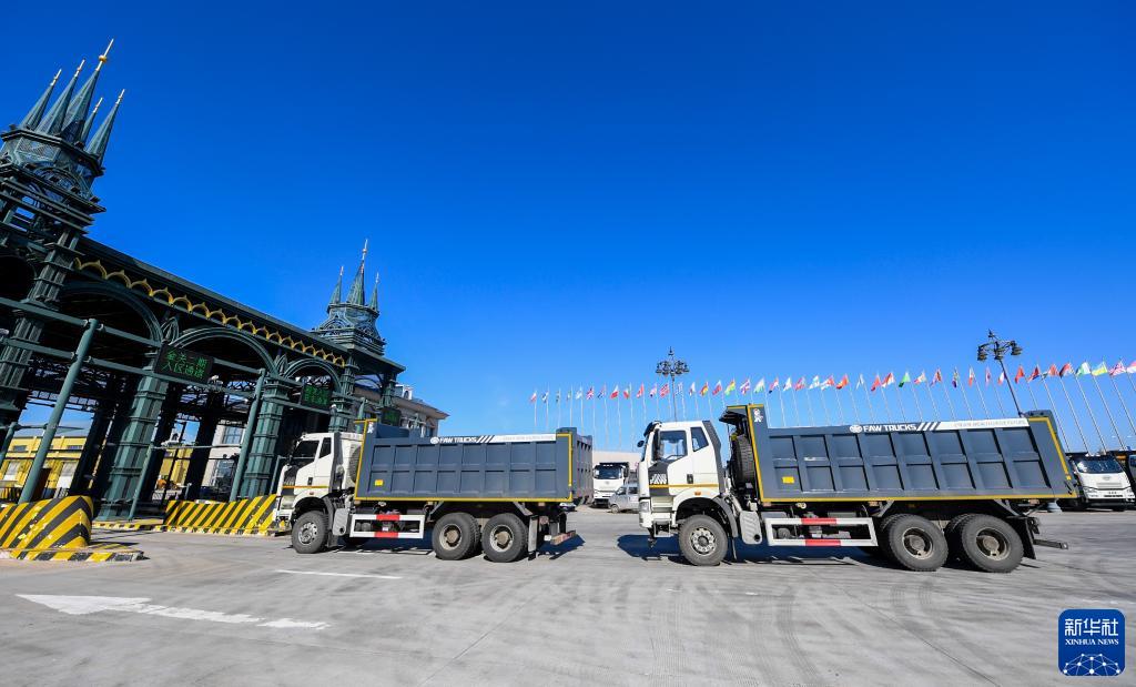 10月12日,工程车辆在满洲里综合保税区通关待检。