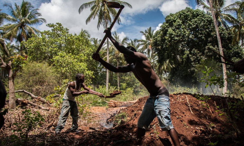 图为当地人在蒙巴萨(肯尼亚第二大城市)附近的烧窑中做木炭。据联合国粮食及农业组织(粮农组织)估计,1990年至2010年期间,由于木炭和木材的生产,导致非洲损失了将近7500万公顷森林。