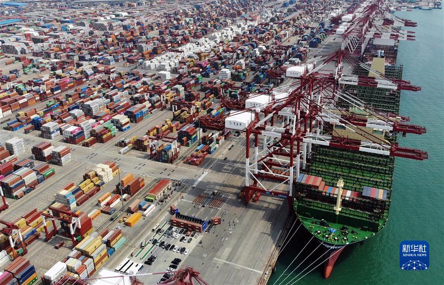 载箱量可达2.4万标准箱的“现代商船阿尔赫西拉斯”轮靠泊在青岛港前湾码头(无人机照片,2020年4月26日摄)。新华社记者 李紫恒 摄
