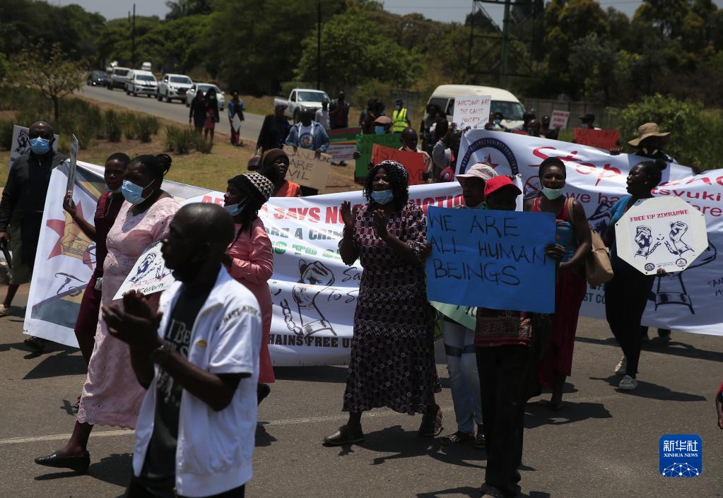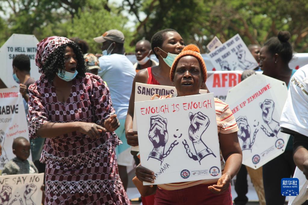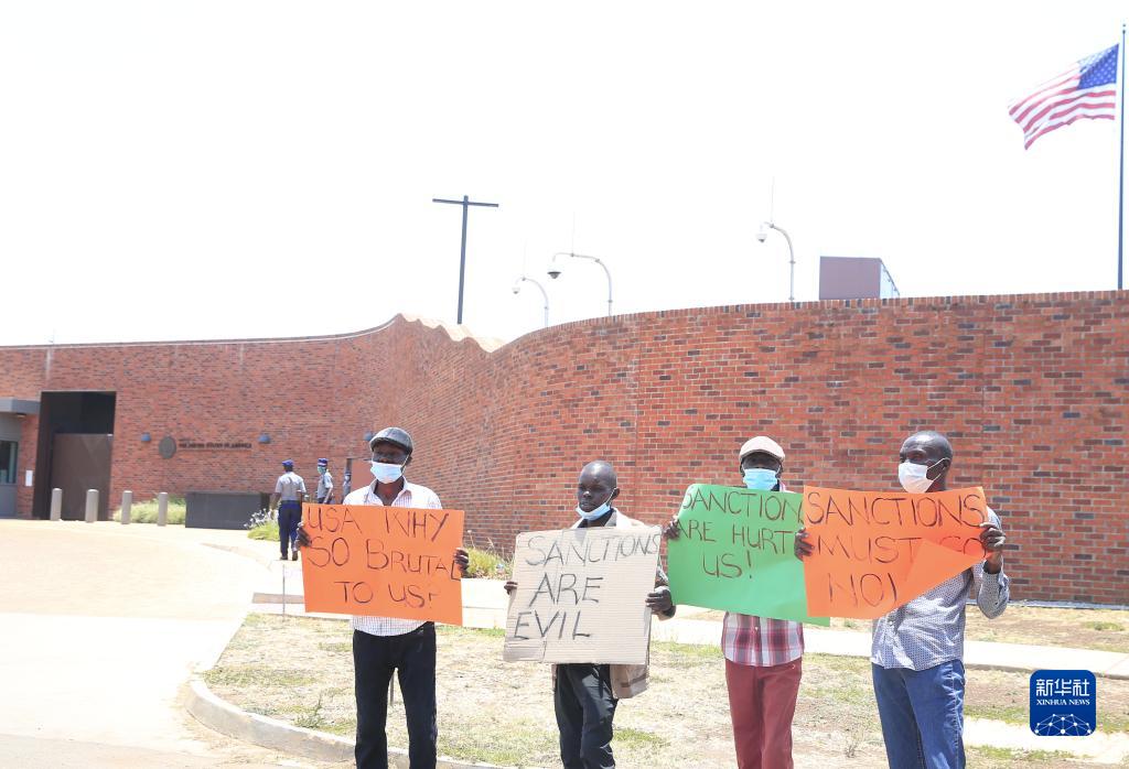 10月25日,人们在津巴布韦首都哈拉雷的美国驻津使馆附近举行游行示威,抗议西方国家对津制裁。